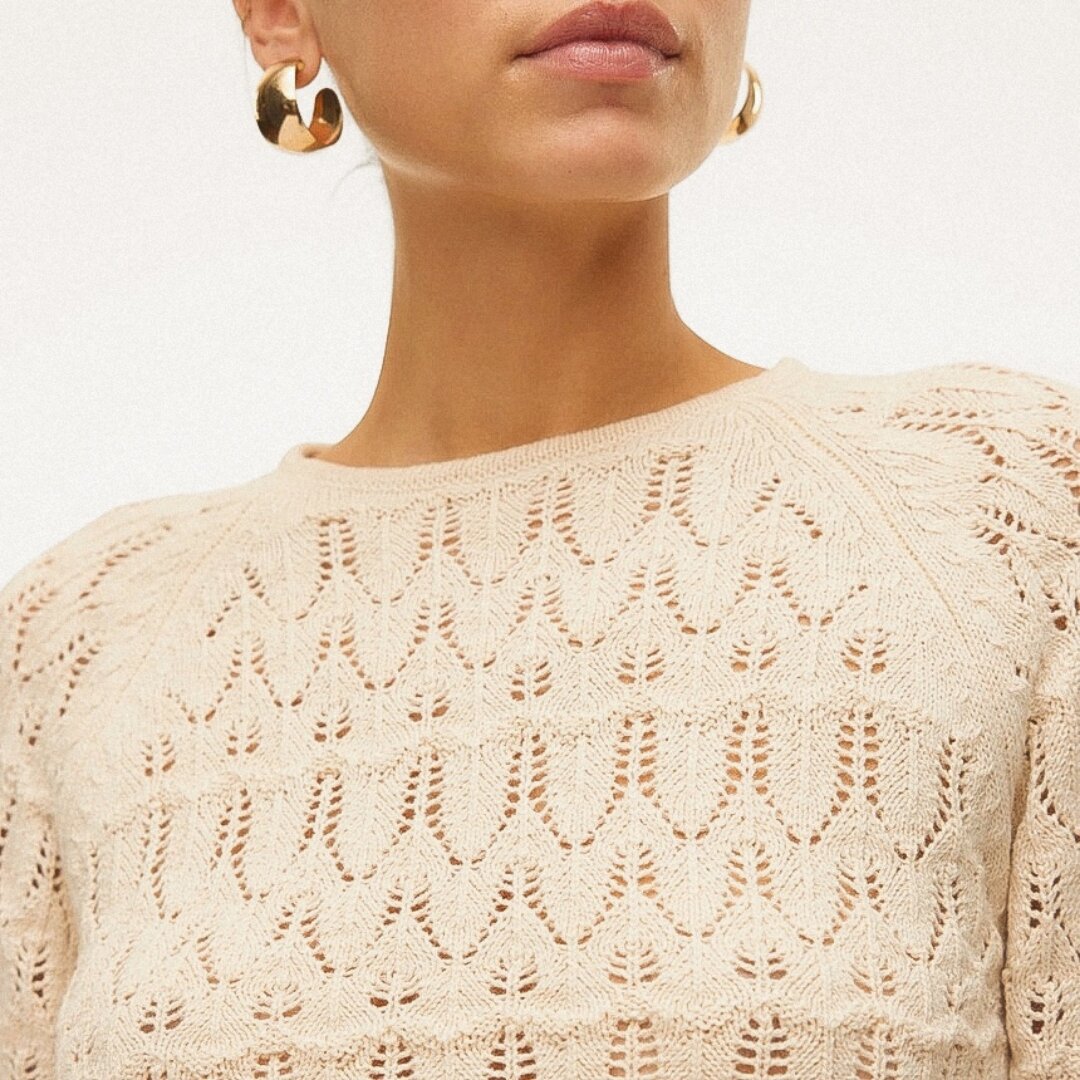 Хлопковый джемпер свободного покроя с коротким цельновязанным рукавом. Узор из жгутов и ажурных дорожек тут расположен по бокам и в верхней части в виде кокетки (переходит на рукава)