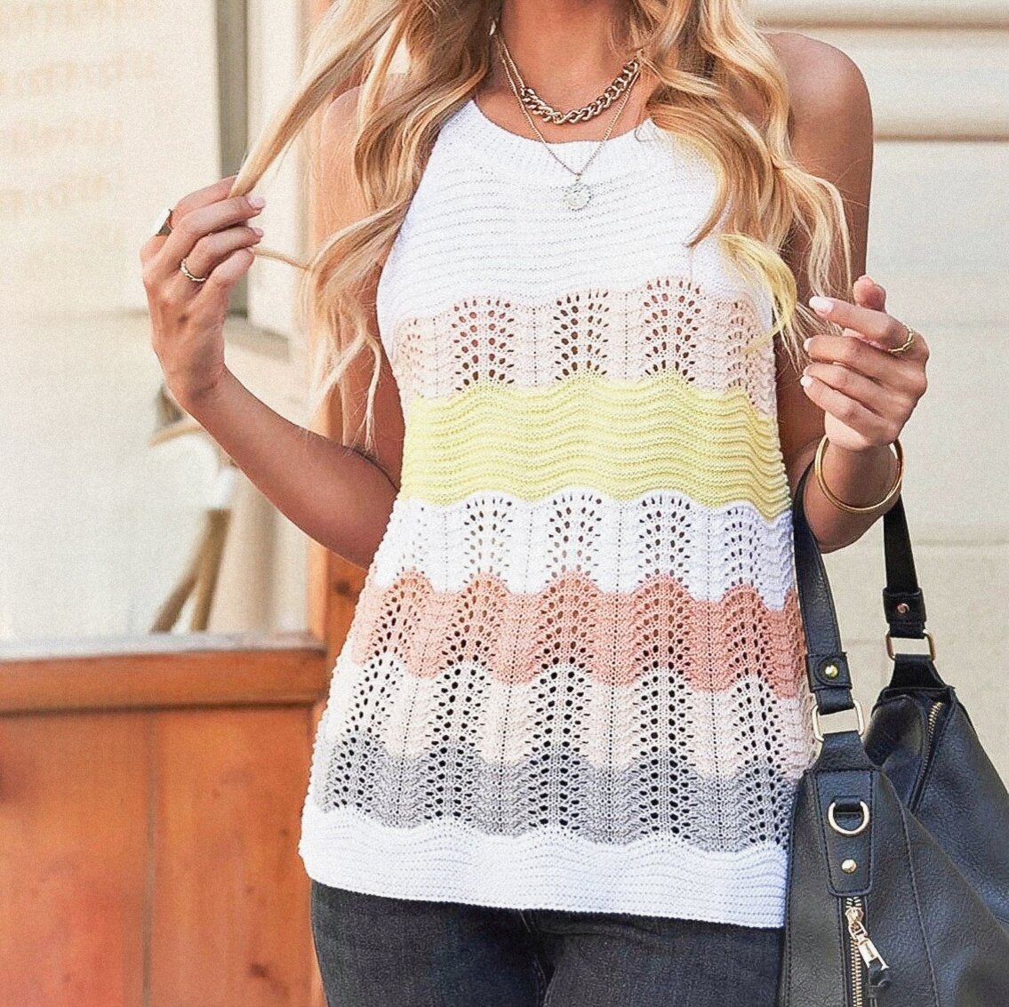 Безрукавка в многоцветном исполнении, выполненная ажурным узором в виде волн