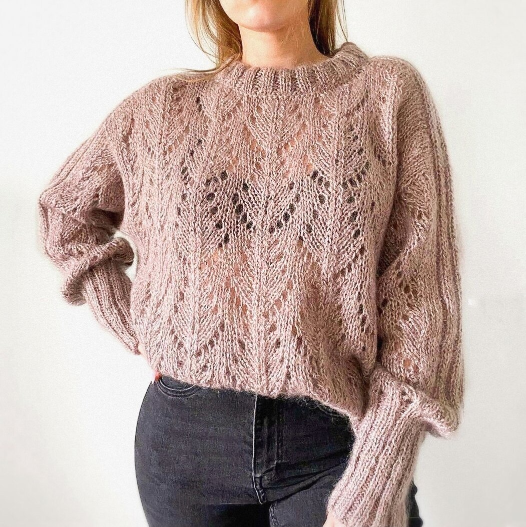 Пуловер с рукавами 3/4 связан очаровательным ажурным узором в виде листьев