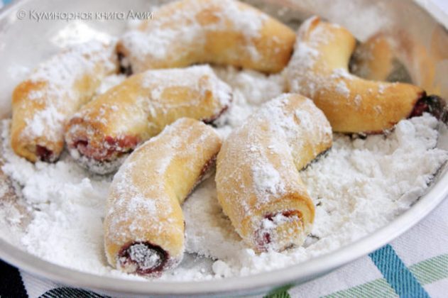 Разрезаем на квадратики 7х7, в середину кладем варенье, скручиваем в трубочку и защипываем край.