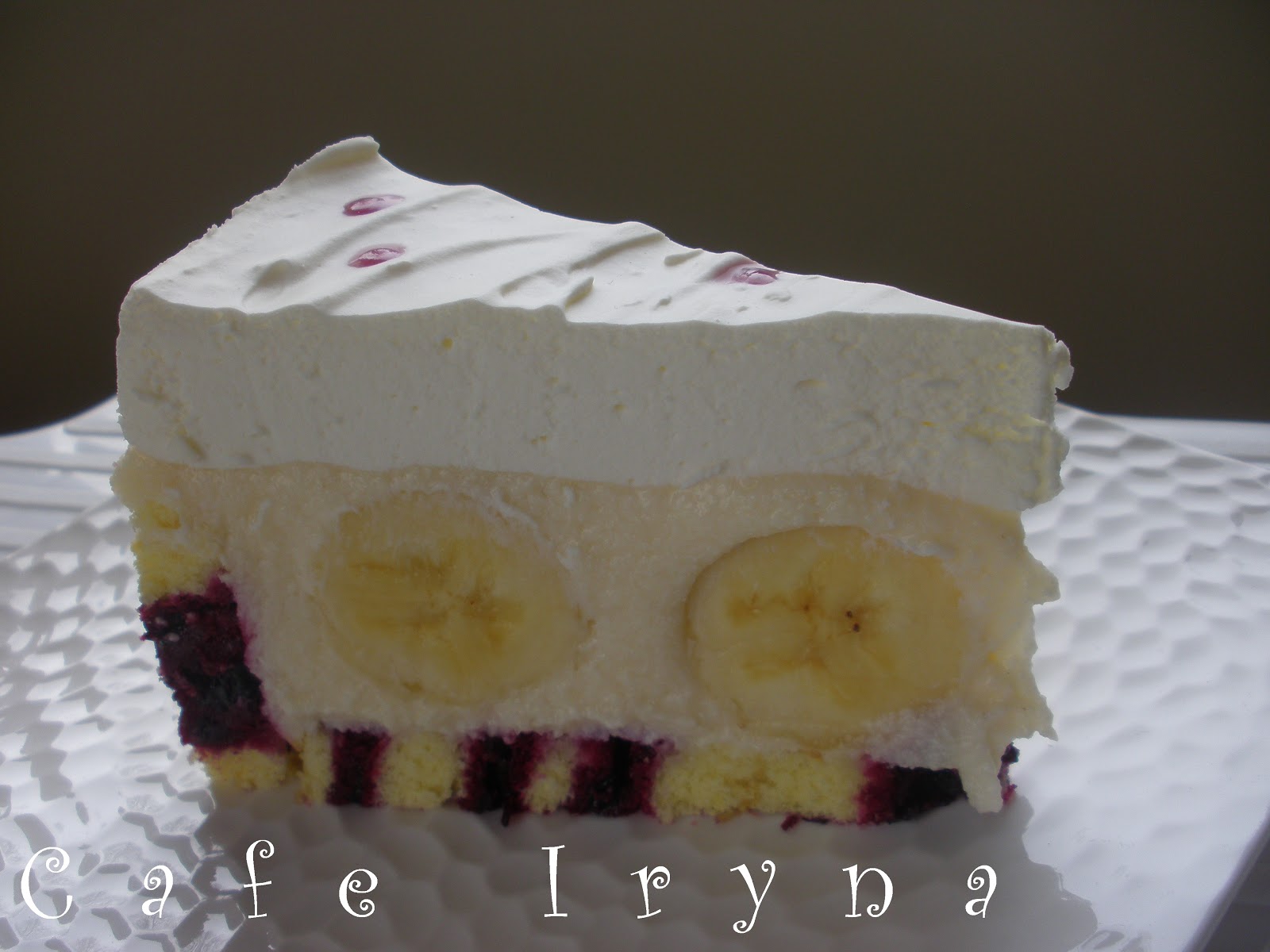 Мой тортик в форме диаметром 20 см.Верхний слой-мусс с йогуртом,чтобы придать легкую кислинку сладким бананам.