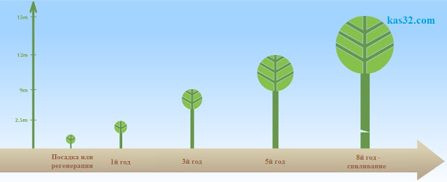 Рост дерева возобновляется от места спила. Благодаря чему, единожды высаженная плантация дает 5-8 урожаев, которые спиливают каждые 8 лет.