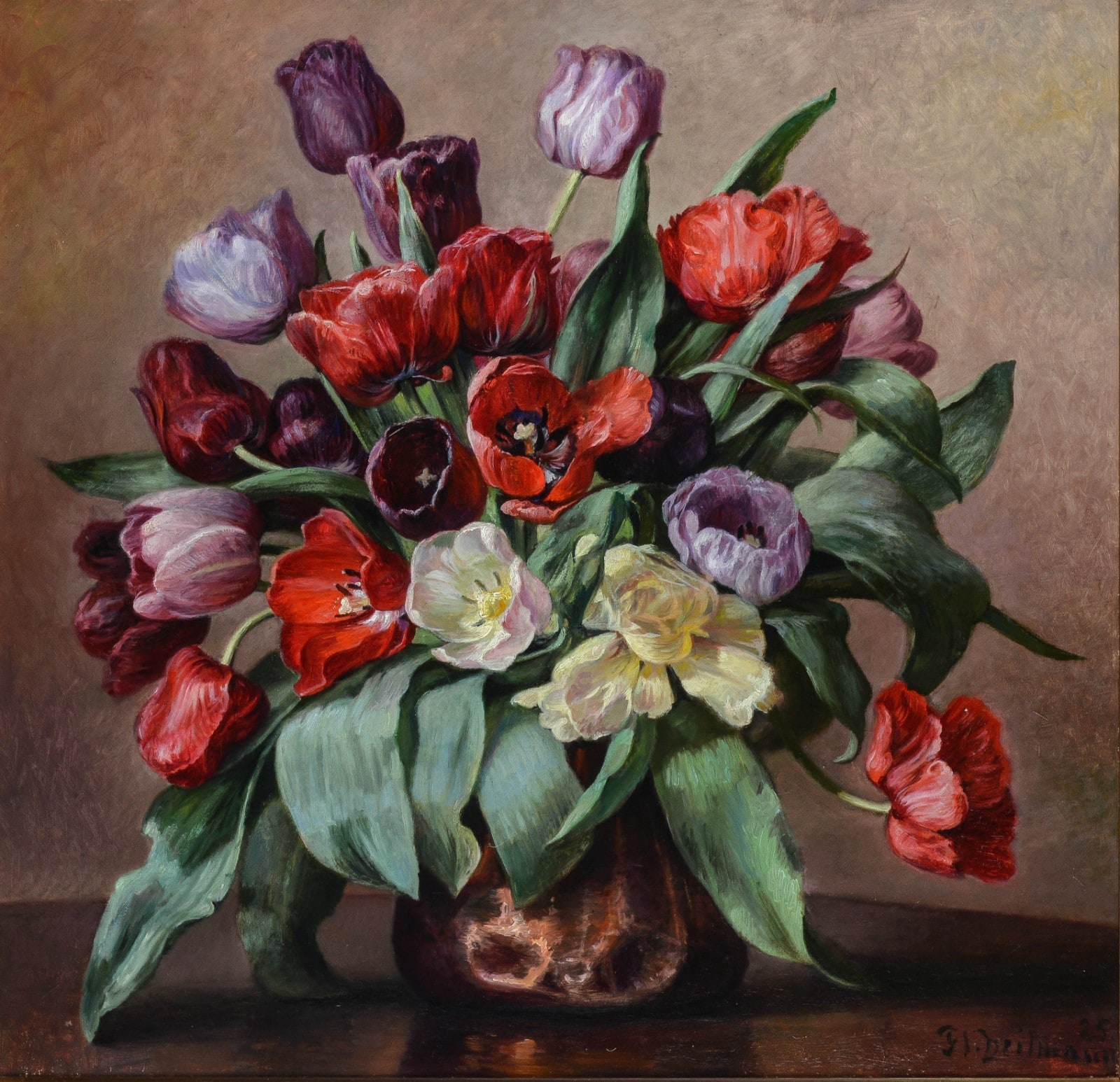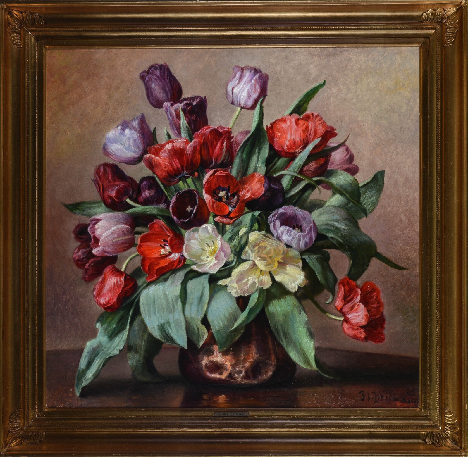 Still life with tulips, an iris, a rose, morning glories and other flowers with a dragonfly, butterfly and other insects