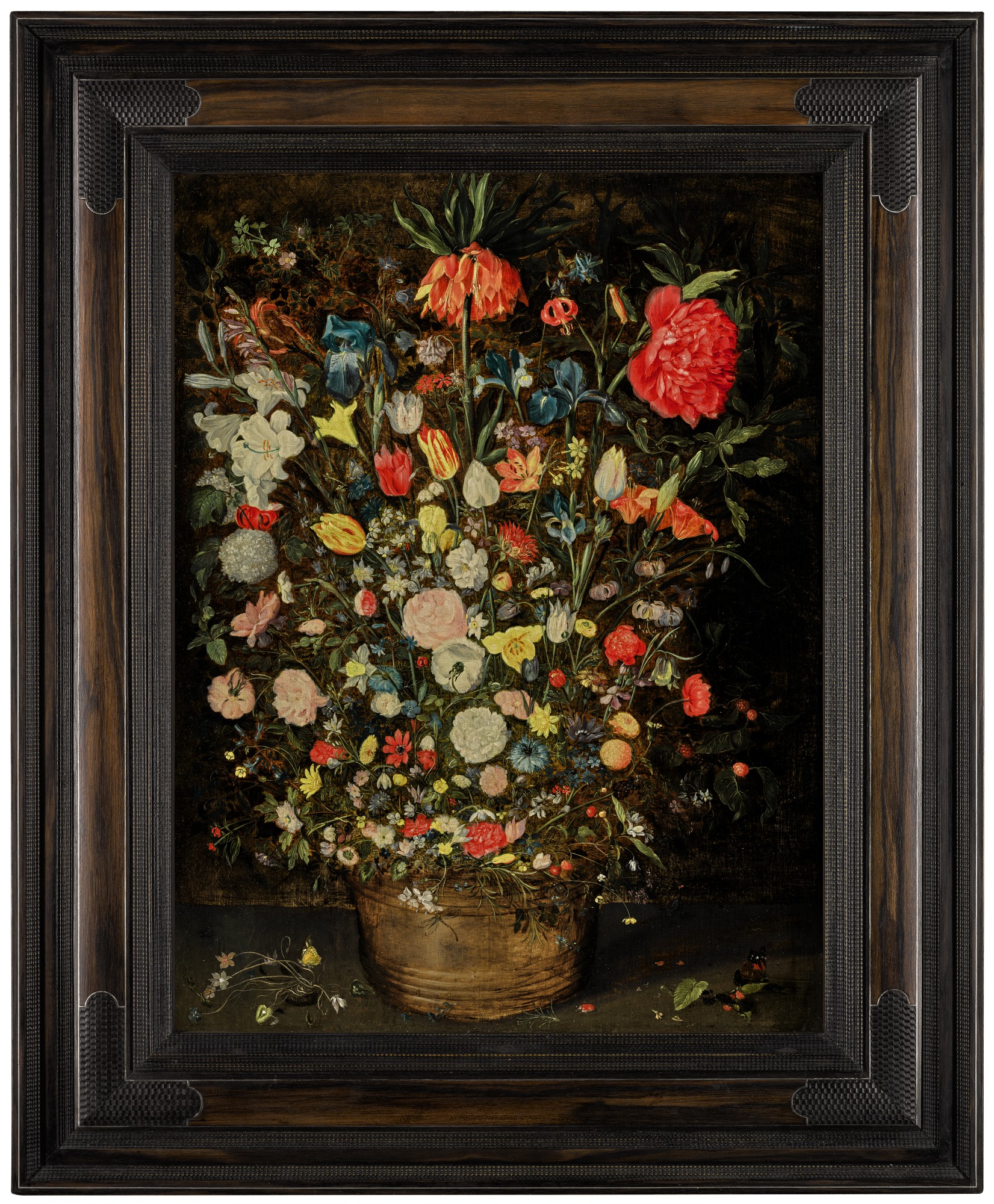 Still life with a large bouquet of flowers in a wooden bucket, including a crown imperial lily, roses, tulips and other flowers, with butterflies, insects and berries on the shelf beneath