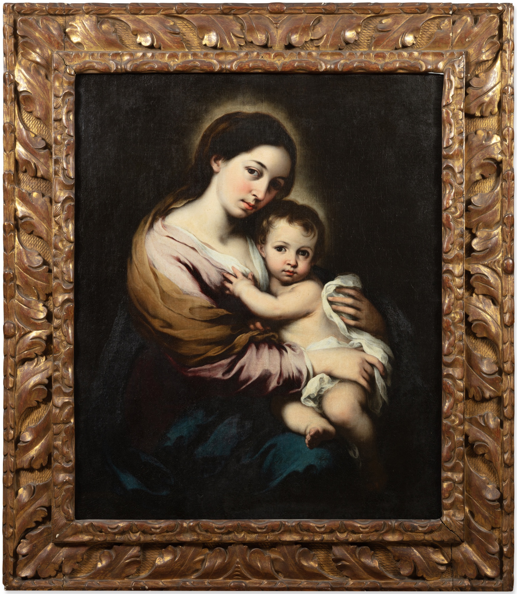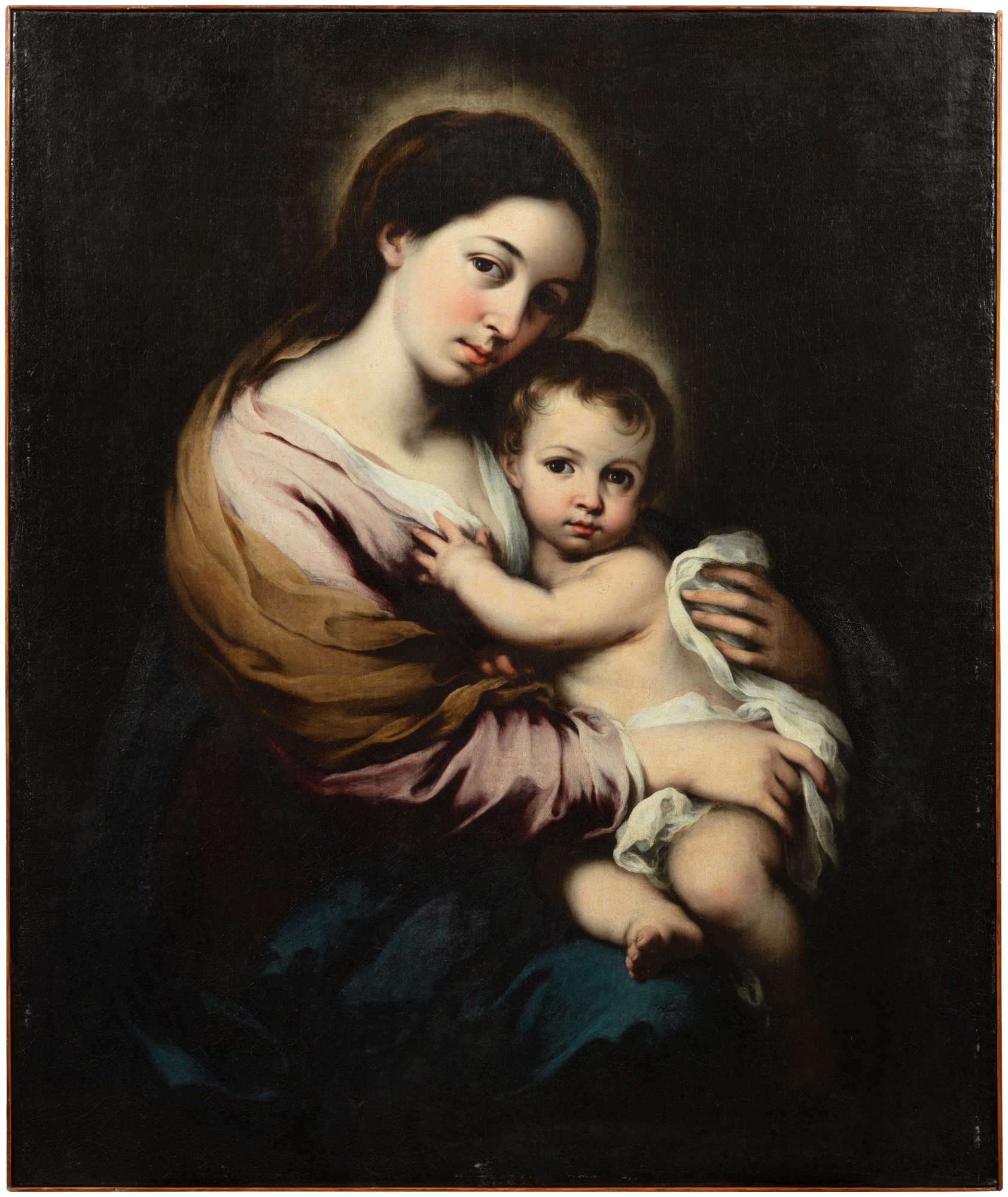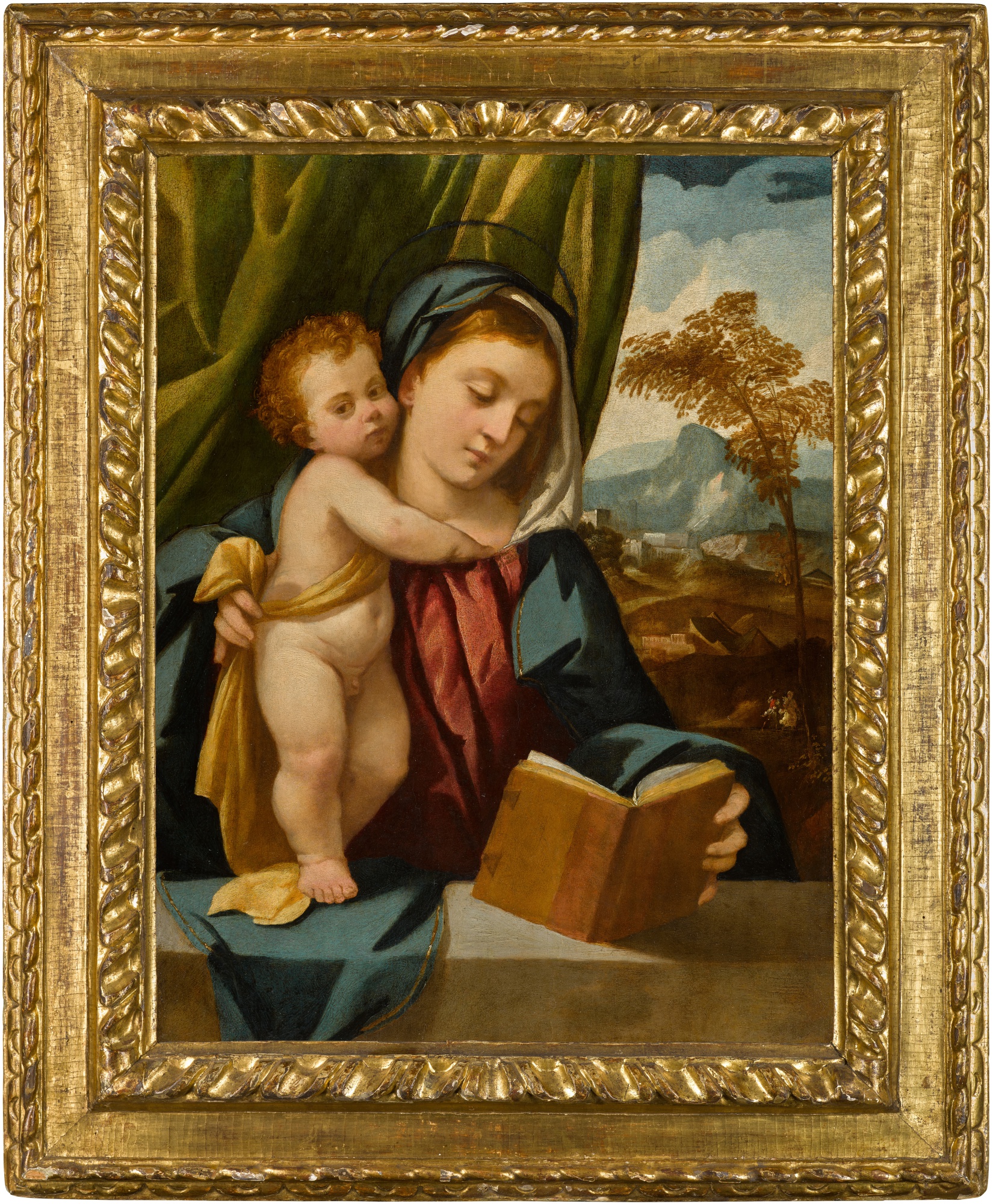 The Virgin reading a book and holding the standing Christ Child, with a landscape beyond