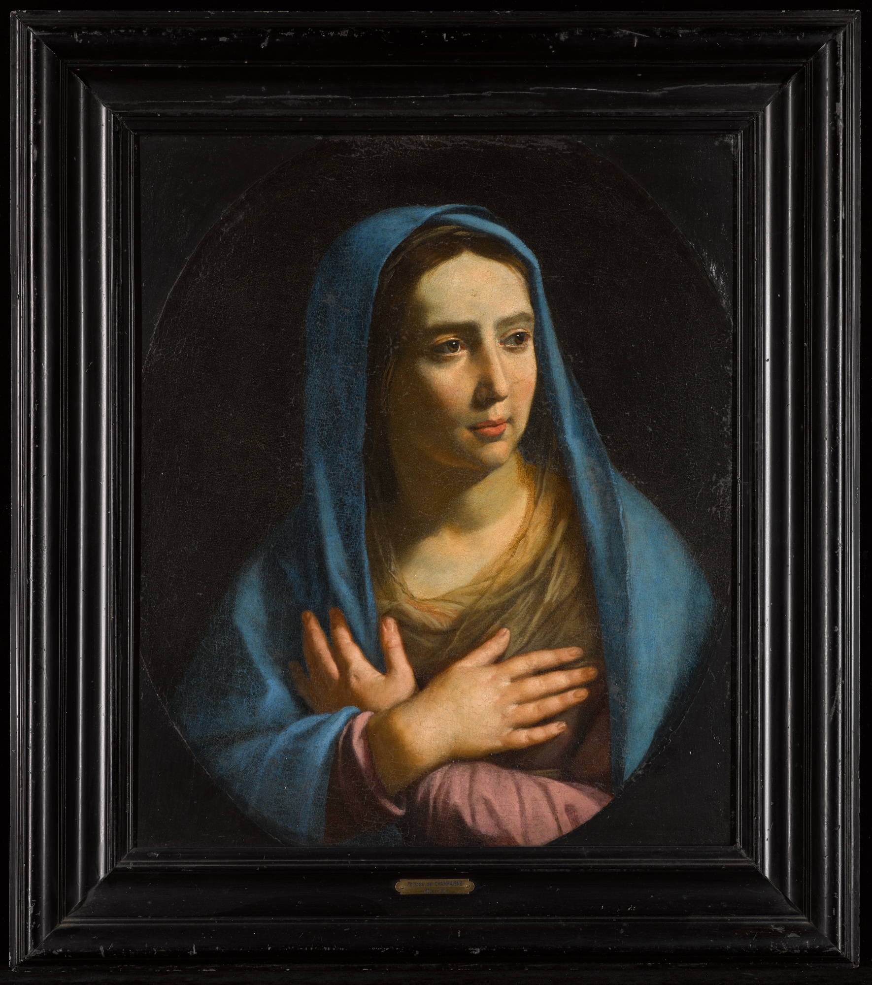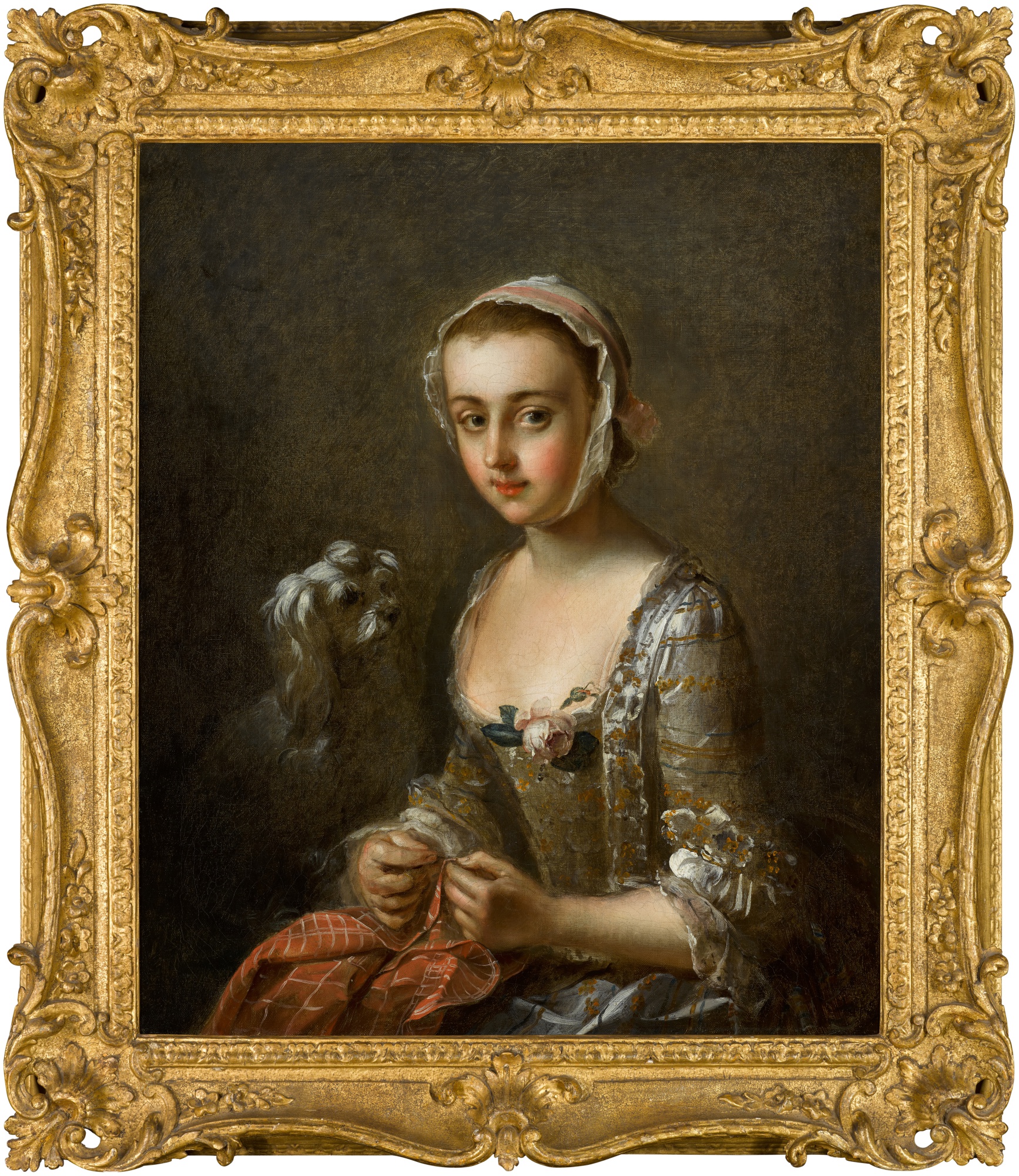 Portrait of Marie-Thérèse Pommyer (born circa 1705), bust-length, wearing a blue velvet dress and white chemise, with a yellow wrap