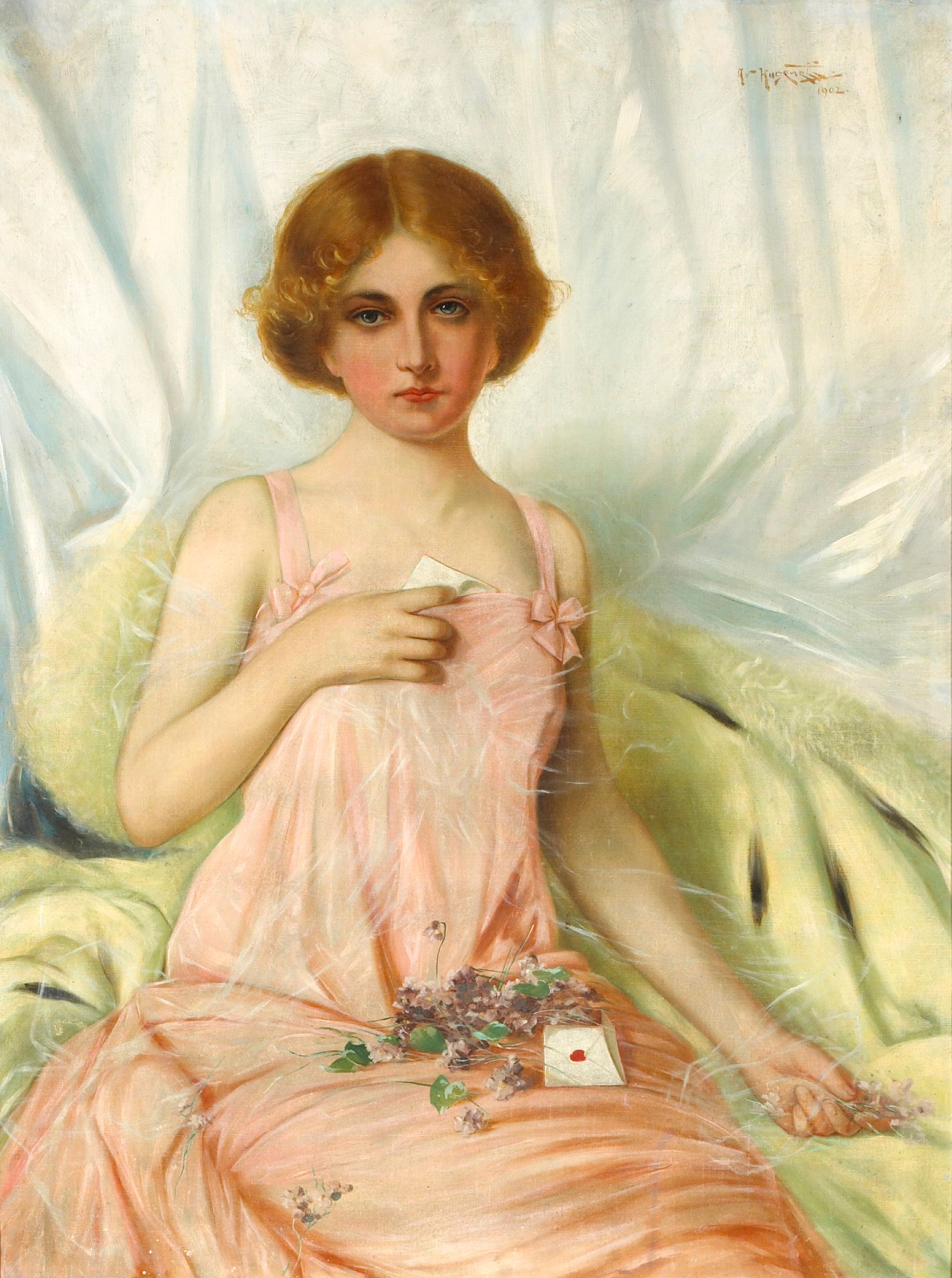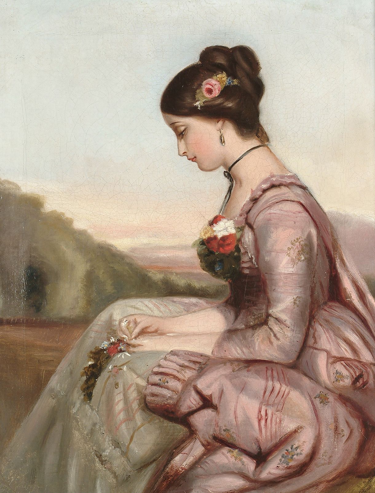 PORTRAIT OF A LADY, SEATED, HOLDING FLOWERS