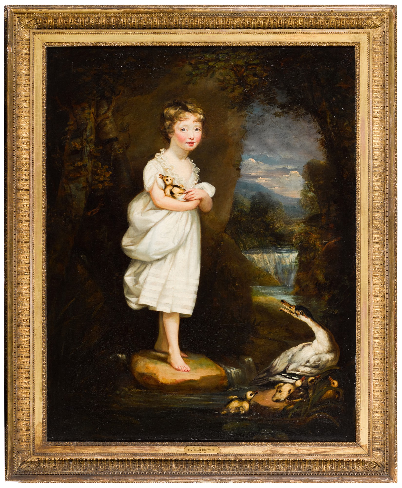 PORTRAIT OF CHARLOTTE LEYCESTER, FULL-LENGTH, WEARING A WHITE DRESS AND HOLDING A DUCKLING