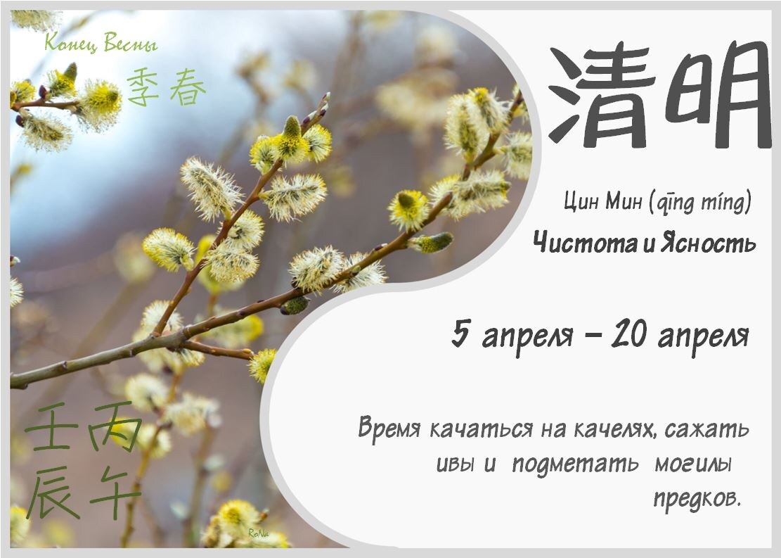 По китайскому календарю 5 апреля начинается сезон Цин Мин (Чистота и Ясность, кит. 清明) – пятый малый сезон из 24 сезонов традиционного китайского календаря, который продлится до 20 апреля. Ежегодно этот сезон наступает 4-5 апреля, когда эклиптическая долгота солнца достигает 15º. Третий весенний месяц (Цзи Чунь кит. 季春 ) в китайском календаре соответствует знаку Дракона (Чэнь 辰 ), и в этом году, он – водный 壬辰. В древних китайских текстах об этом времени говорится: