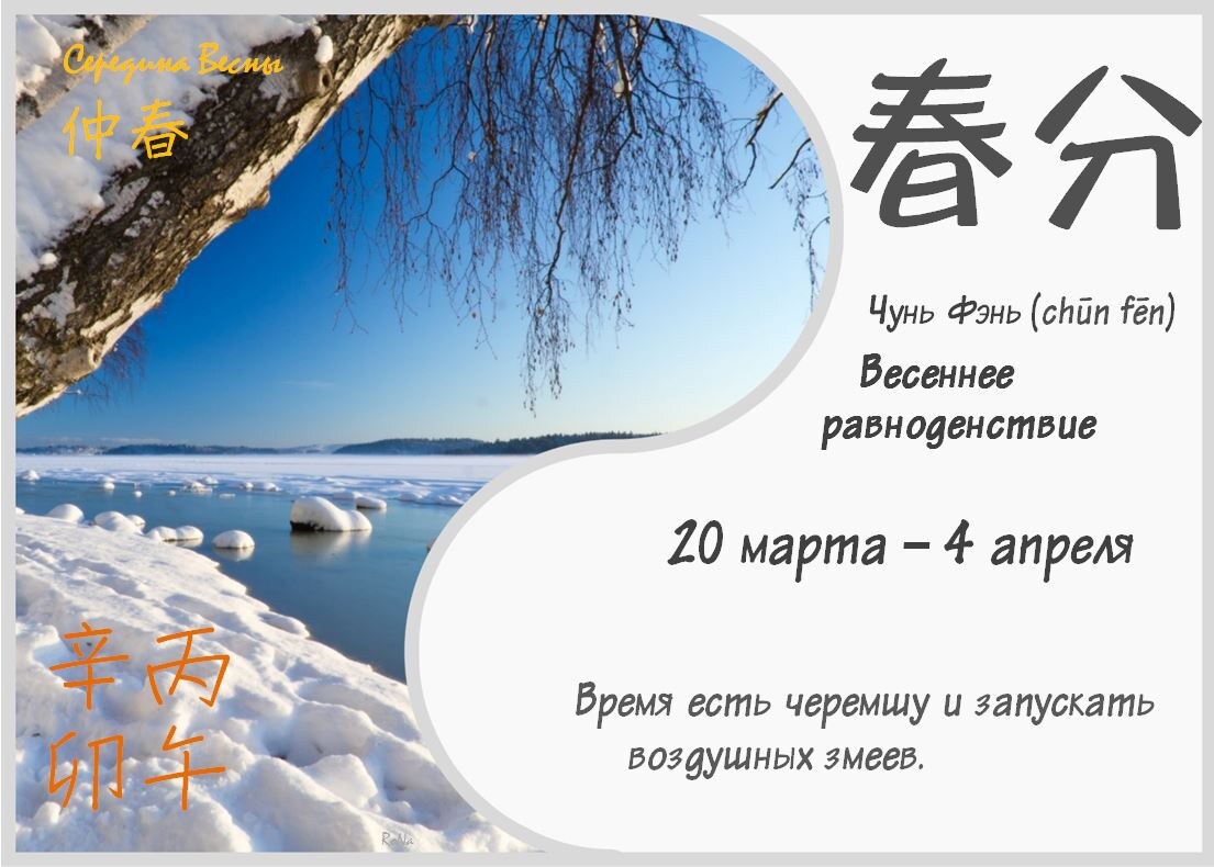 По китайскому календарю 20 марта начинается сезон Чунь Фэнь – Весеннее равноденствие 春分 (chūn fēn), серединная точка девяностодневной Весны. Это четвертый малый сезон из 24 сезонов традиционного китайского календаря и вторая половина месяца Середины весны 仲春 (Чжун Чунь). Ежегодно этот сезон наступает 20–21 марта, когда эклиптическая долгота солнца достигает 0º. В первый день этого сезона продолжительность дня равна продолжительности ночи. Солнце восходит точно на востоке и заходит точно на западе. В этот день природа находится в гармонии, наступает равновесие между началами «Инь» и «Ян» (阴阳平衡, yīnyáng pínghéng).
