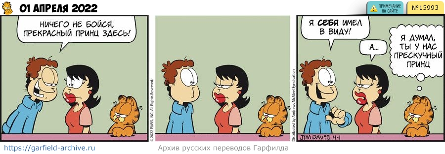 | Записки переводчика к стрипу Мне очень понравился этот вариант перевода "prince boring", что предложил читатель. Да, дословно всё же просто "скучный", и вообще вся шутка строится на том, что "charming" скорее фамилия, чем характеристика. Соответственно, "boring" просто рифмуется с ним по смыслу. В русском варианте с помощью приставки "пре" на скучности делается акцент. стрип переведен 04/04/2022 | |