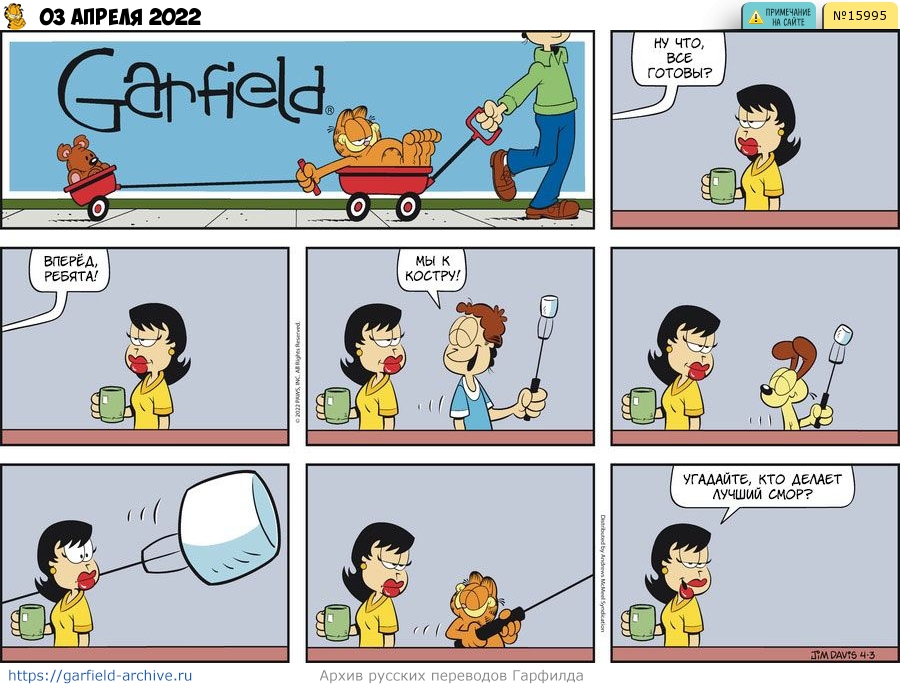 | Записки переводчика к стрипу Смор (s'more) - традиционный американский десерт, который дети готовят на костре. Аналогов в русской культуре не найдено, зато найдена русская статья на Википедии, в которой десерт по-русски так и назван - «смор». стрип переведен 27/04/2022 | |
