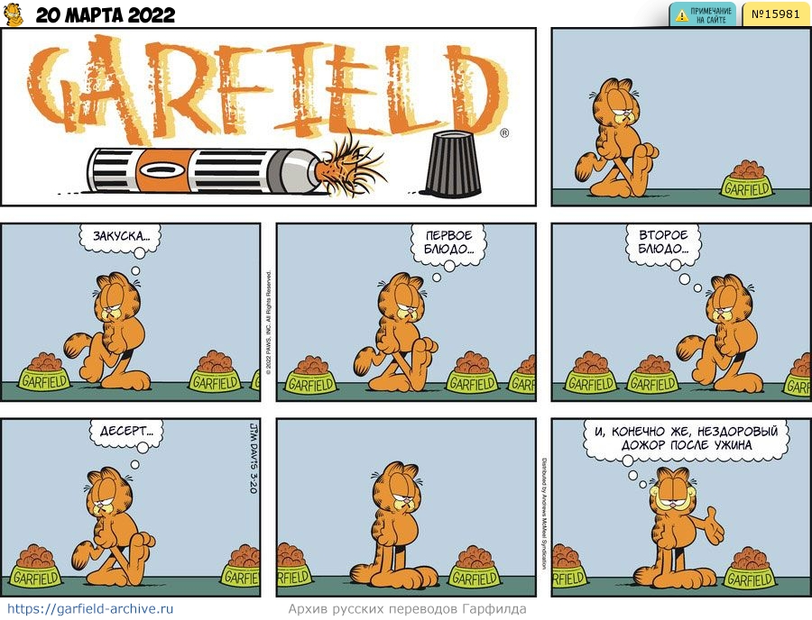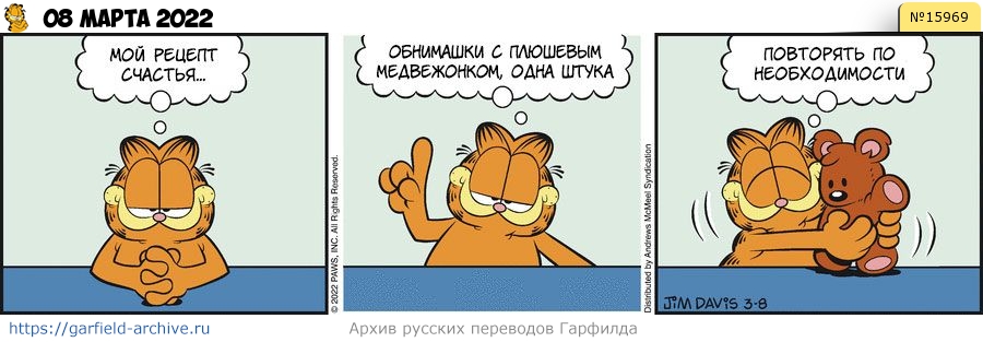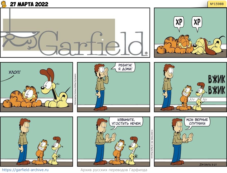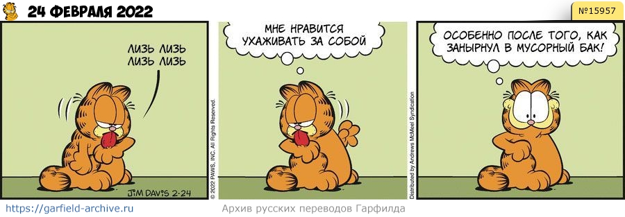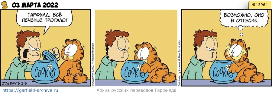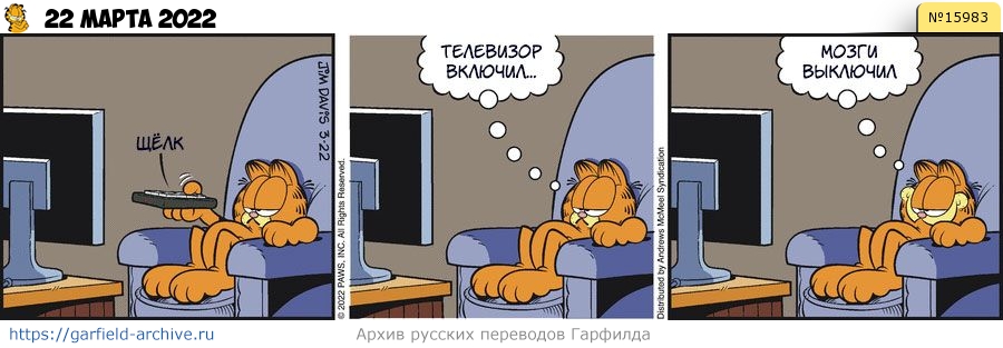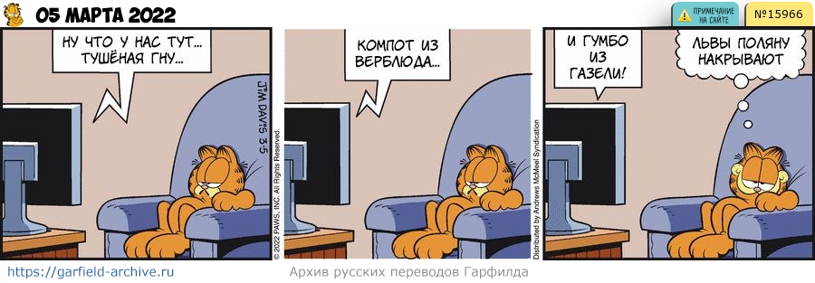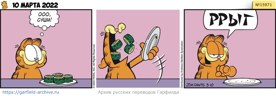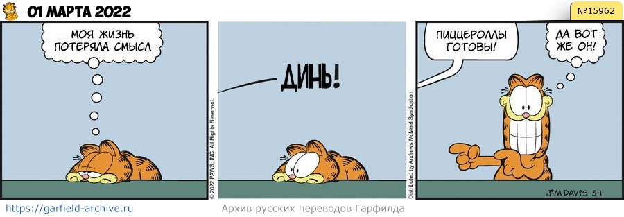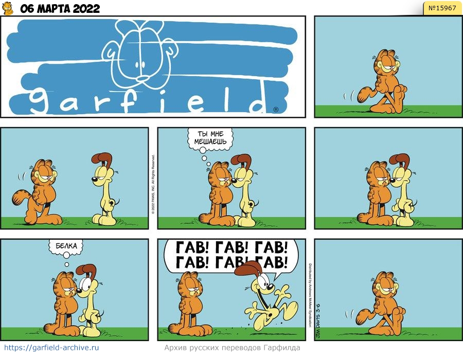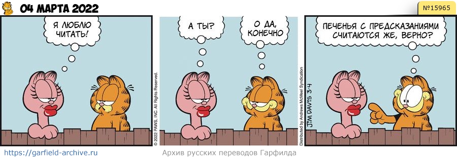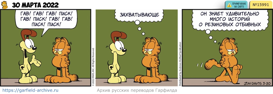 | Записки переводчика к стрипу Вообще Гарфилд говорит не просто о резиновых отбивных, а о резиновых свиных отбивных. Правда, из-за этого целиком его речь не умещалась в "облачко". Ну с другой стороны действительно - если отбивная резиновая, какая разница - свиная или нет?.. стрип переведен 30/03/2022 | |