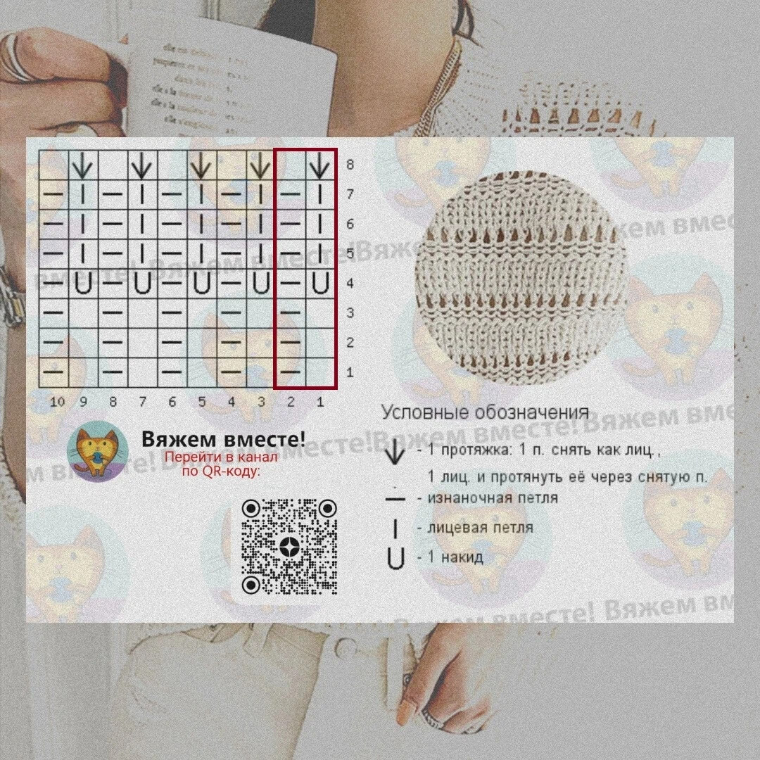 Раппорт узора составляет 1 петлю и 8 рядов. На схеме даны как лицевые, так и чётные ряды. Петли обозначены так, как они лежат на лицевой стороне полотна.