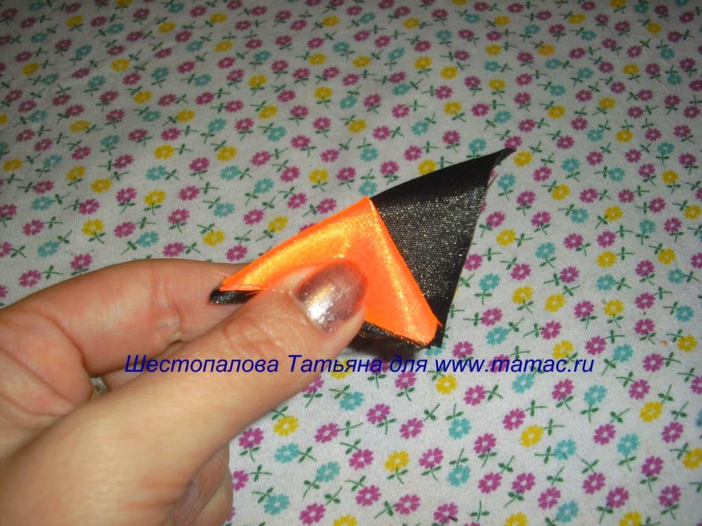 Теперь складываем заготовку посередине. Придерживаем пальцами сторону со сгибом, осторожно обрезаем по диагонали угол. Созданный срез придерживаем пинцетом и опаливаем огнем. Делаем это тщательно, чтобы оба слоя ткани спаялись вместе. Теперь расправляем деталь, располагая шов посередине. Из оставшихся длинных заготовок делаем такие же уголки. Теперь из черной ленты вырезаем маленький круг, диаметром в 4 см. Опаливаем срезы полученной детали, которая будет основанием для броши. Разворачиваем кружок изнаночной стороной вверх и приклеиваем на него первый уголок. Затем прикрепляем остальные углы, образуя звезду. Теперь создаем веточку для украшения звезды. Для этого из оранжевой и черной ленты вырезаем квадраты со стороной в 5 см. Потом берем черную и оранжевую деталь и формируем из них треугольники, просто сложив их по диагонали. Теперь накладываем их один на другой, полностью совместив срезы одной стороны. Придерживая пальцами, загибаем верхнюю часть оранжевого треугольника. Затем повторяем сложение с краем черного треугольника. Крепко придерживая все слои, складываем треугольник пополам. Располагая черную ленту в центре детали. Обрезаем острые края детали. На огоньке опаливаем новый срез, одновременно спаивая сложения лент. Теперь от линии сгибов отступаем 0,7 см и ножницами отрезаем все лишние ленты. Затем опаливаем срезы, равномерно распределив их на две равные части. В результате получаем двойной лепесток с черной серединкой. Подобных лепестков подготавливаем всего 5 штук. Затем из них собираем веточку. Сначала скрепляем вместе два лепесточка. Потом скрепляем еще две детали и присоединяем их к предыдущей паре. Оставшийся лепесток приклеиваем между пары деталей, обозначая им верхушку веточки. Теперь полученную веточку присоединяем к звезде, располагая ее под небольшим наклоном. Дополняем веточку крупными белыми бусинами на ниточке, выкладывая их вдоль линии середины детали. Переворачиваем звезду изнаночной стороной вверх и по центру приклеиваем металлическую заготовку броши. Брошка «Звезда» из атласных лент готова!