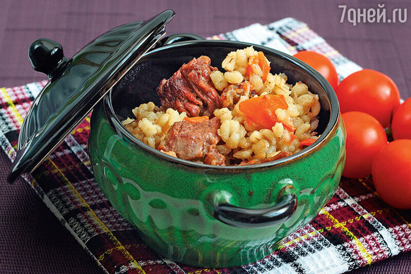 Пока крупа готовится, нарезаем свинину и говядину маленькими кусочками (если не хотите использовать мясо, возьмите курицу или индюшатину). Репчатый лук мелко-мелко нарезаем, морковь натираем на крупной терке. В небольшом чугунке или утятнице разогреваем сливочное масло, обжариваем лук, добавляем к нему морковь, все вместе обжариваем на среднем огне. Добавляем мелко нарезанное мясо и обжариваем еще некоторое время, помешивая, потом наливаем столько воды, чтобы она покрыла мясо. Солим, перчим, убавляем огонь, закрываем крышкой и тушим на медленном огне, пока мясо не станет мягким.