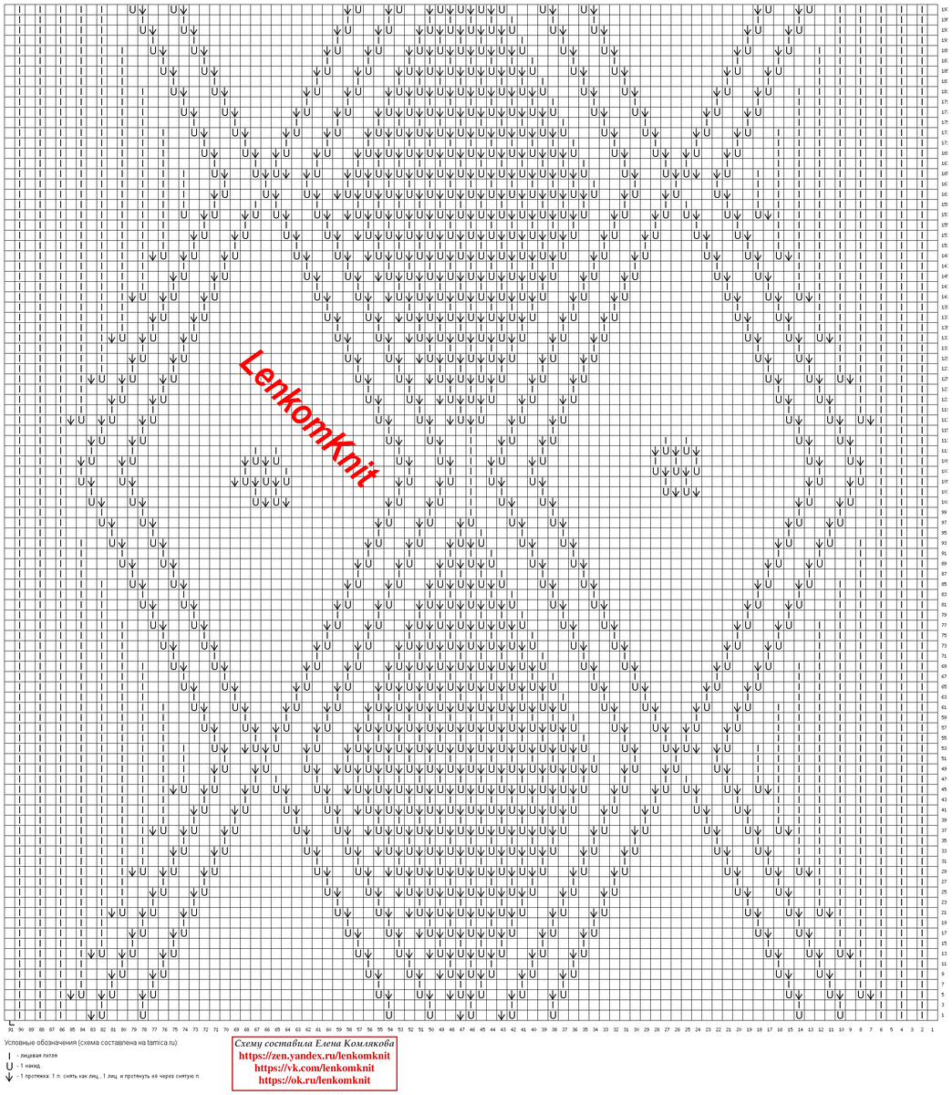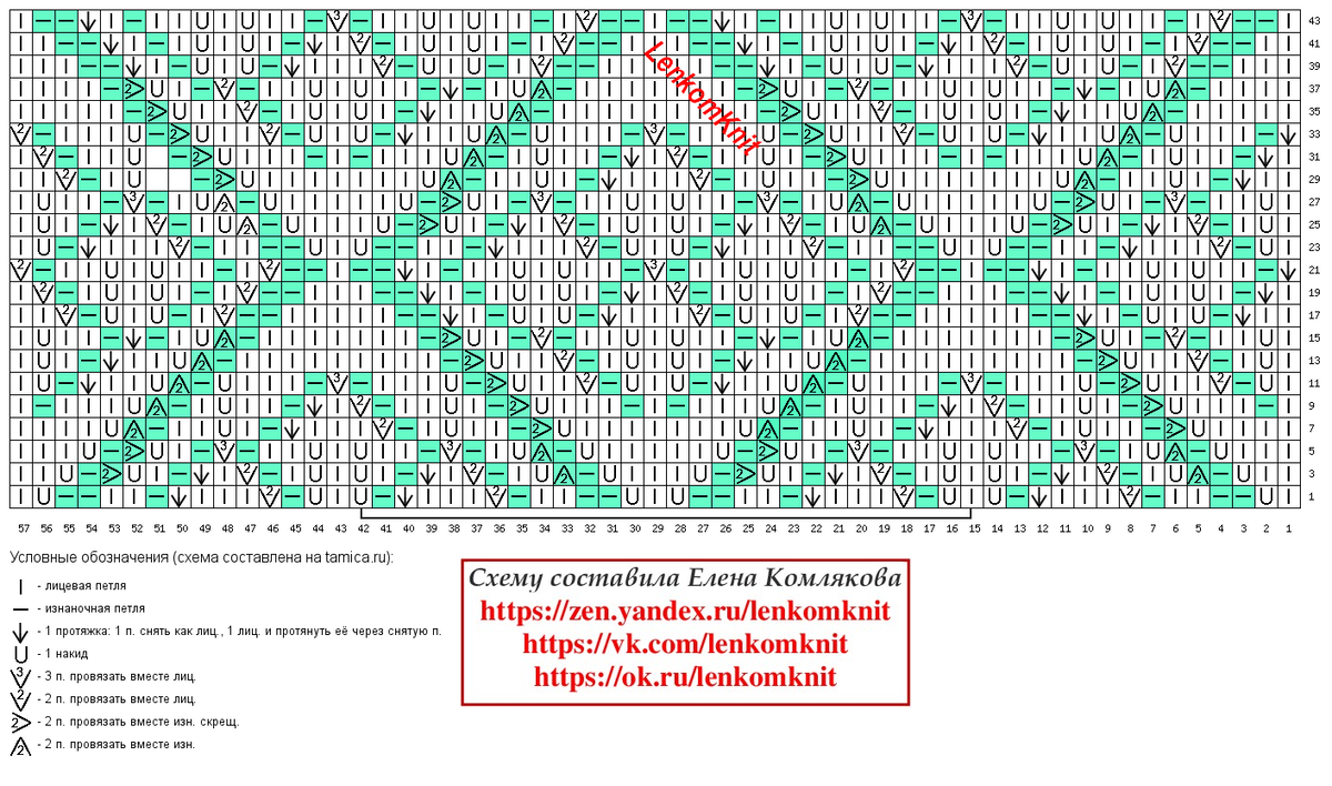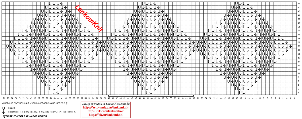 На схеме - три ромба в ширину, один раппорт в высоту. По ширине раппорт выделен в нижней части схемы маркером. Такой узор (ажурная часть ромба) получается за счет того, что накиды компенсируются провязыванием вместе лицевой двух петель с наклоном в сторону этого накида (влево). За счет этого ажурный узор получается более фактурным, чем это было бы с традиционным наклоном этих петель вправо.