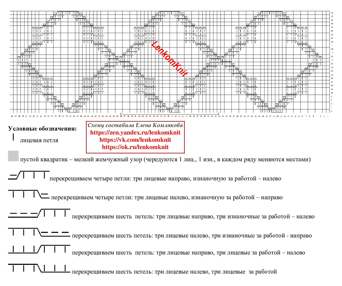 Схема этого узора примерная. Технически она правильная, проверена на небольшом черновом образце. Но под вопросом остается наклон петель, когда они провязываются две вместе (там, где идут контуры ромбов). Можно попробовать на правой стороне делать наклон этих петель в правую сторону, а с левой стороны - налево.