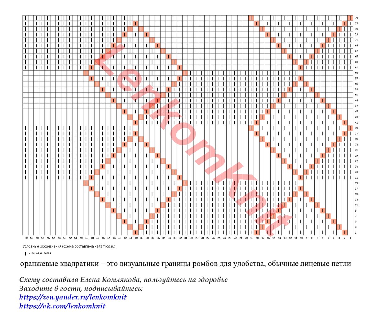 На рисунке - схема узора. Контуры ромбов, заполненных жемчужным узором, для удобства отмечены оранжевым цветом.