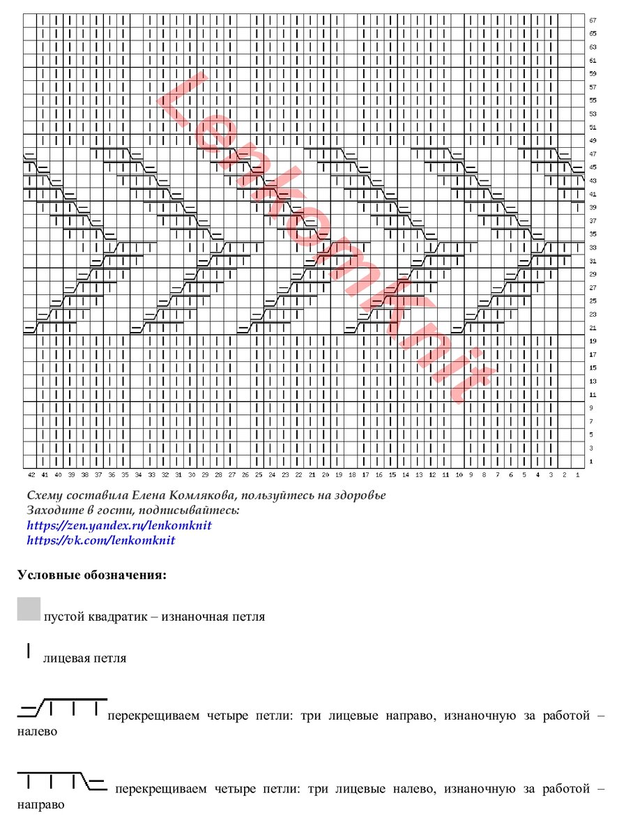 На рисунке - схема узора с условными обозначениями. В ширину раппорт этого узора - восемь петель. А в высоту - ряды с 1 по 48.