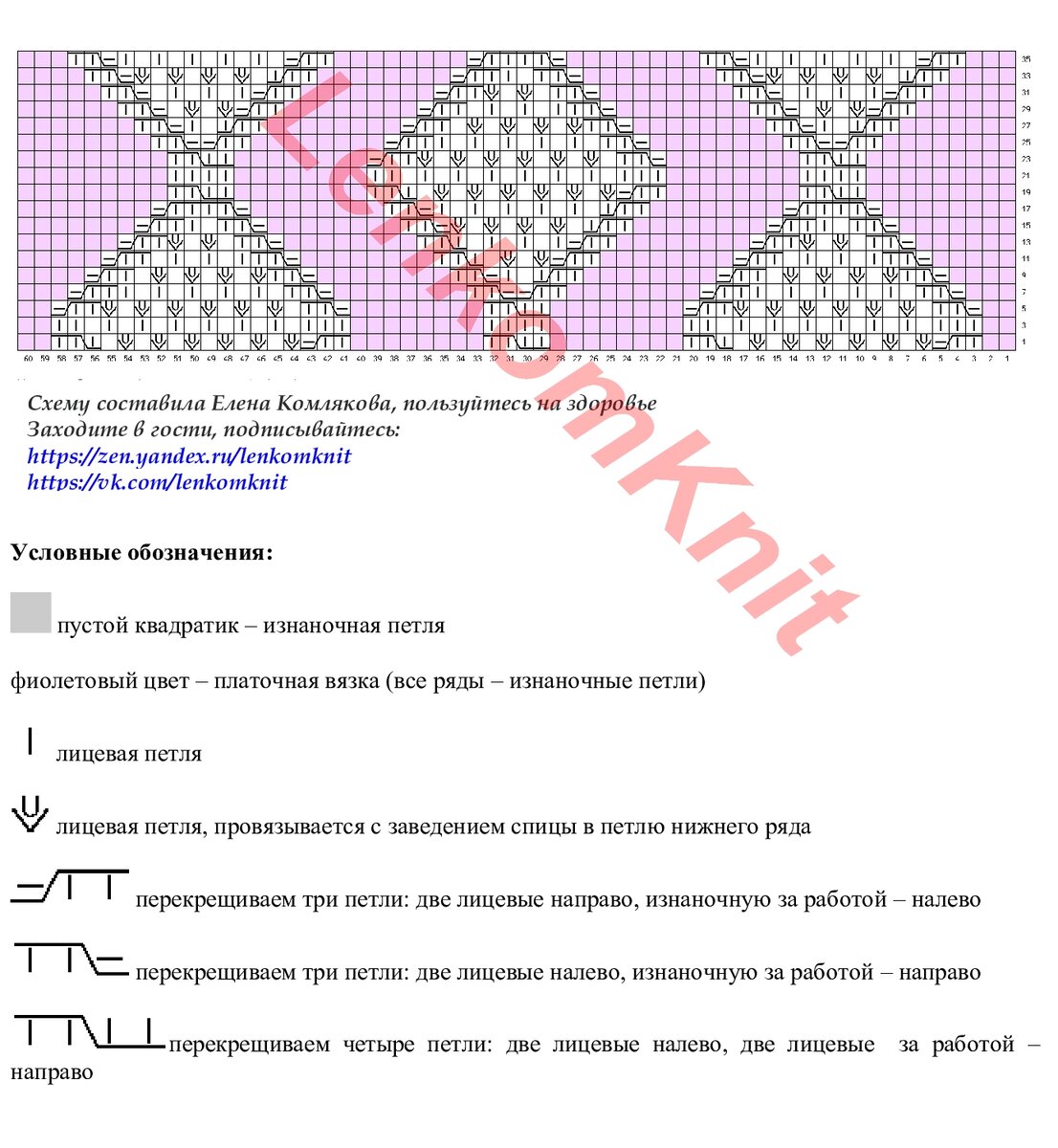 На рисунке - схема ромбов. Сиреневые петли между ромбами - это платочная вязка.