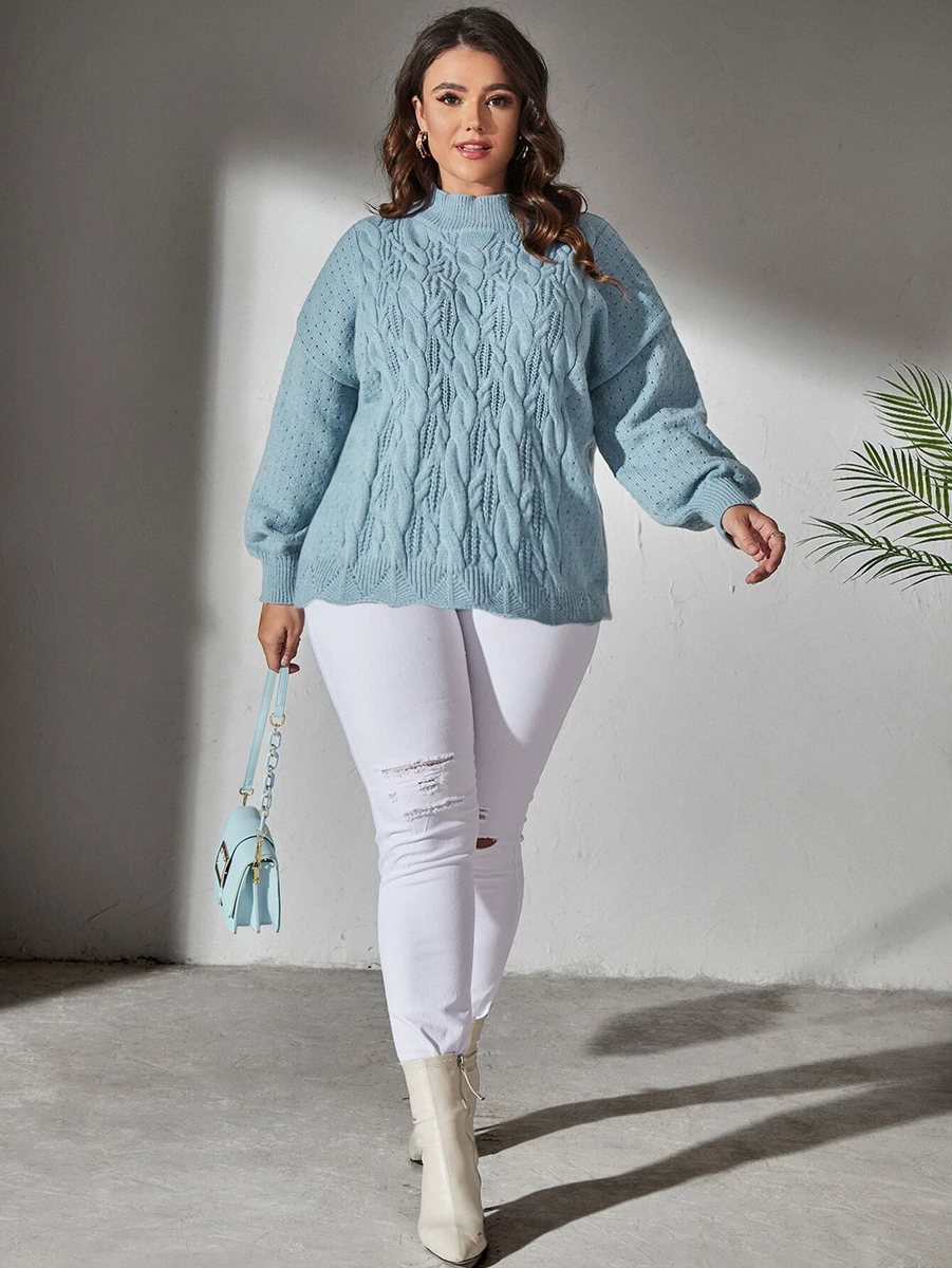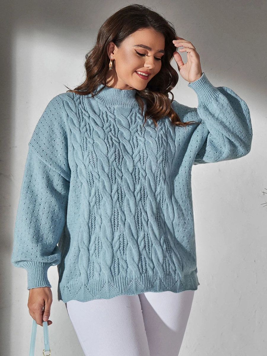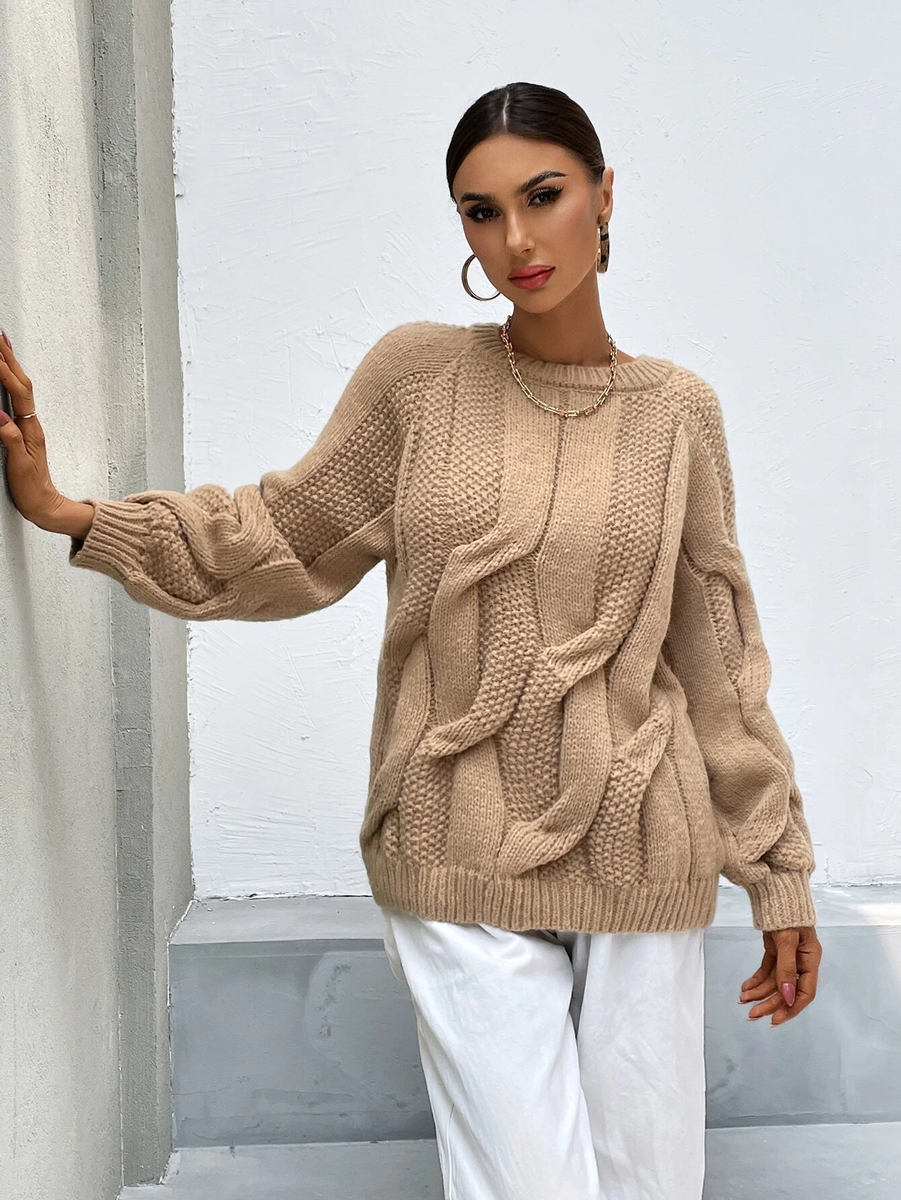 Десятый свитер вяжется по такому же принципу, что и предыдущий. Косы в нем получаются очень объемными за счет того, что при перекрещивании та половинка косы, которая находится сверху, надвязывается укороченными рядами.