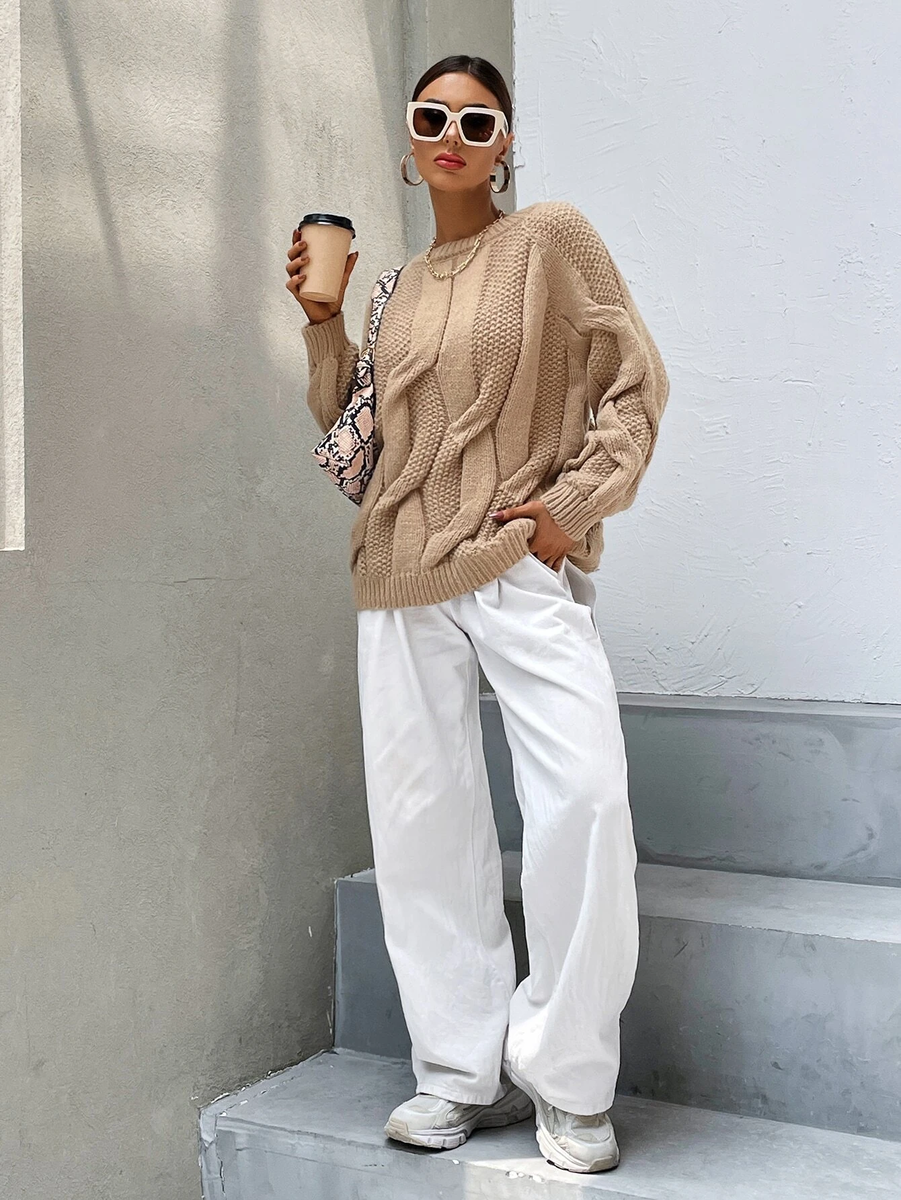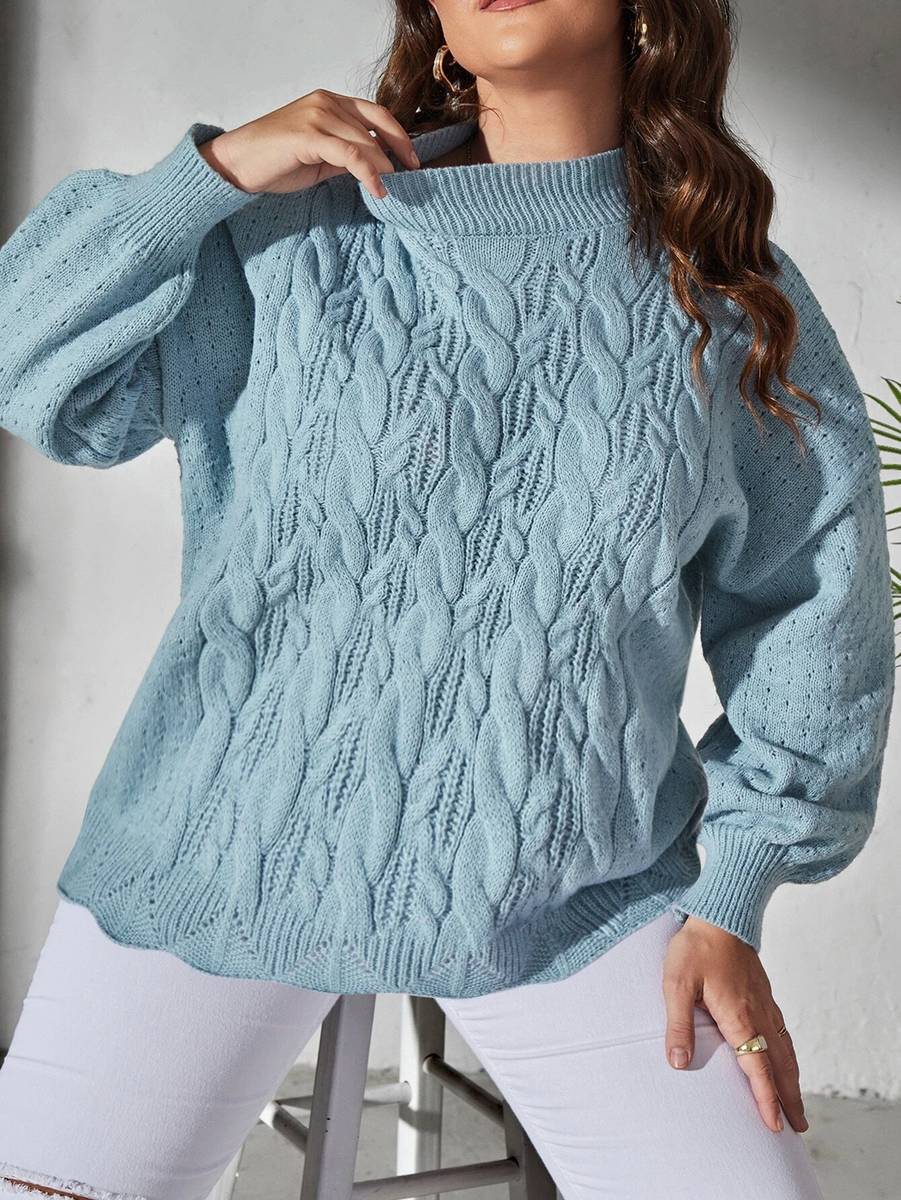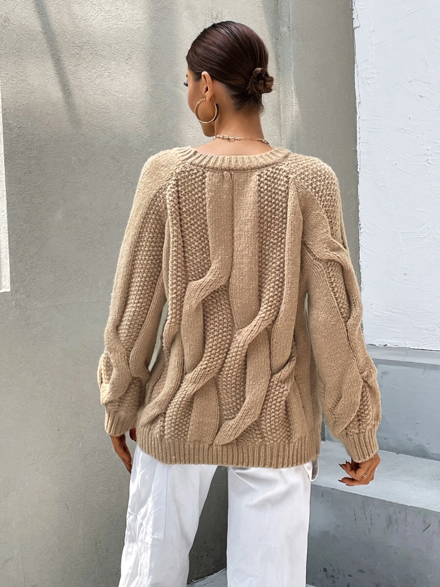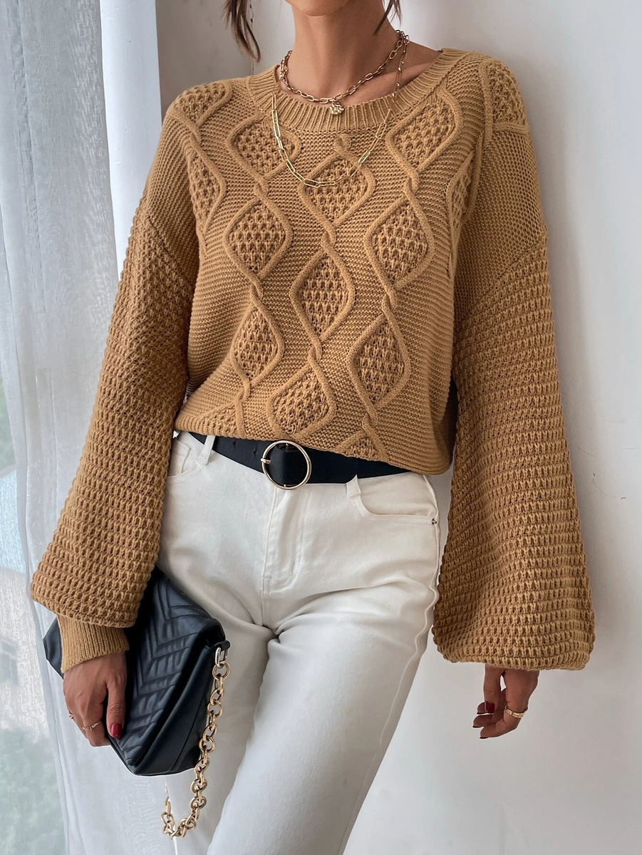 Десятый свитер вяжется по такому же принципу, что и предыдущий. Косы в нем получаются очень объемными за счет того, что при перекрещивании та половинка косы, которая находится сверху, надвязывается укороченными рядами.