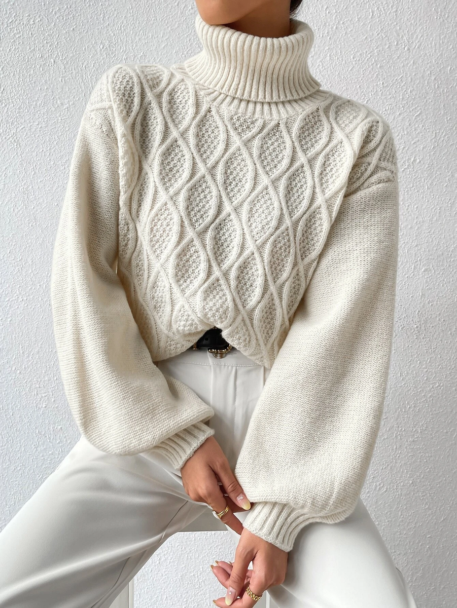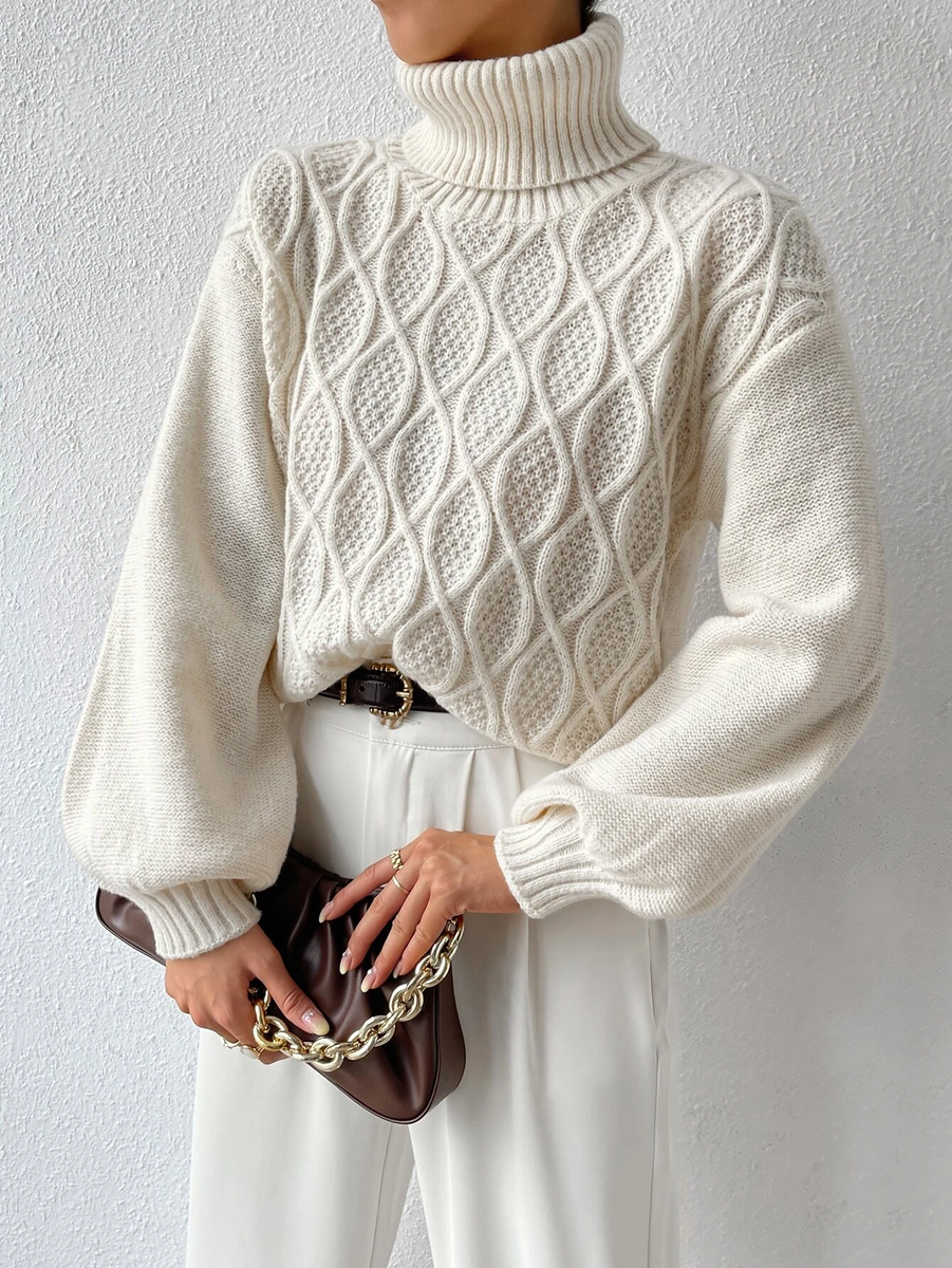 Восьмой свитер белого цвета с воротником - гольф смотрится очень эффектно за счет интересных аранов (честно говоря, это не новинка, но он мне очень понравился).