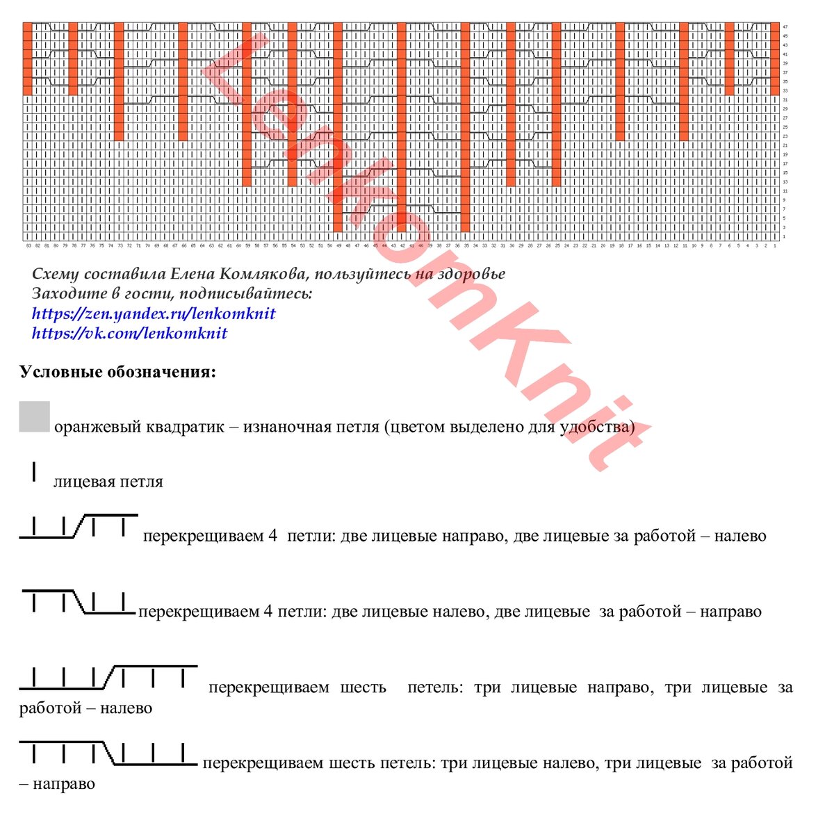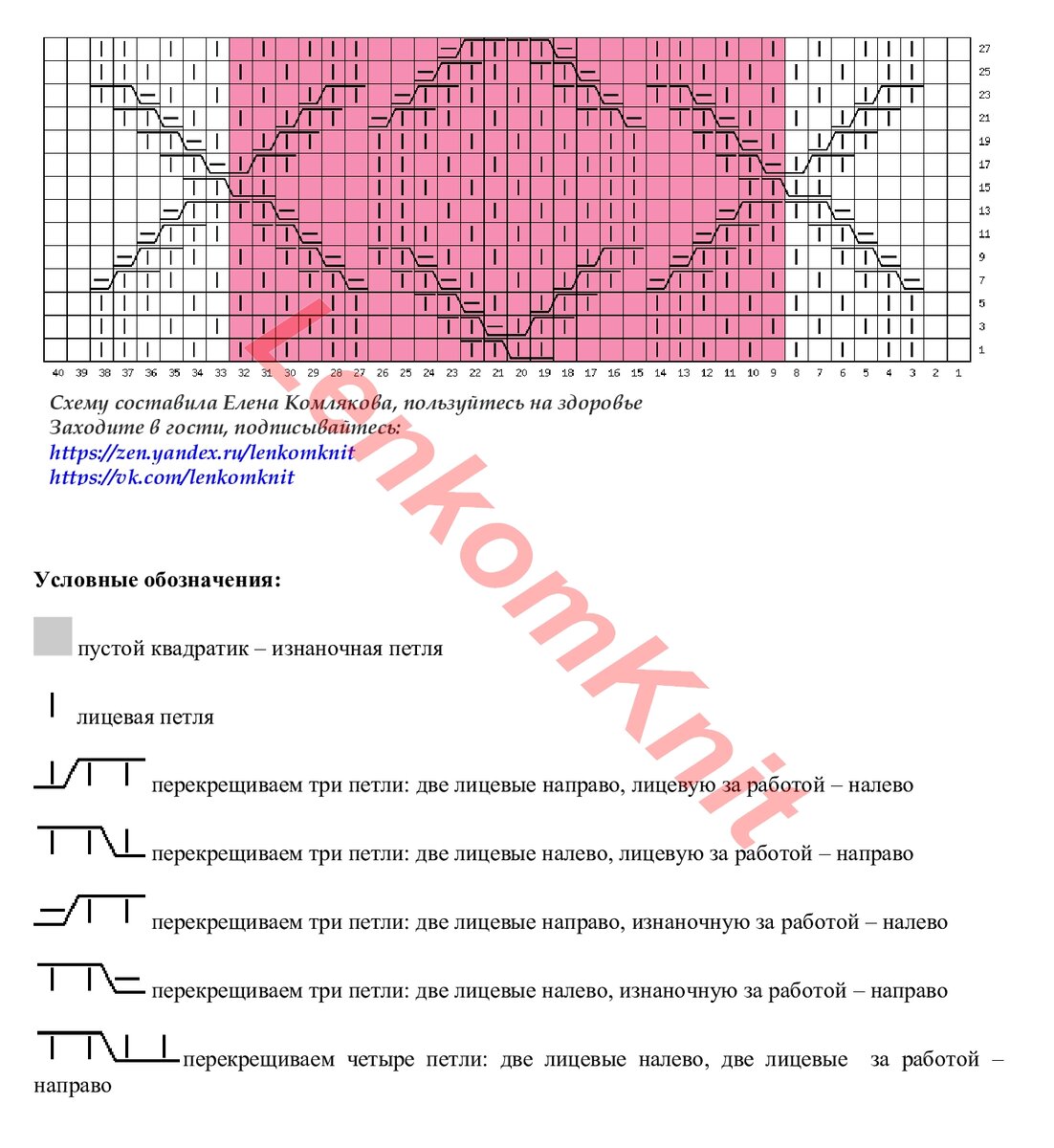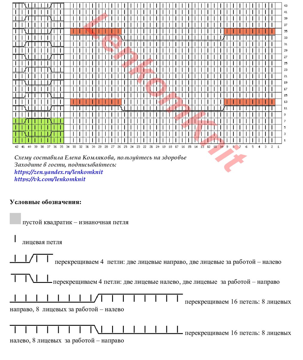 На схеме я выделила раппорт узора в высоту (28 рядов) и в ширину (петли с 9 по 32).