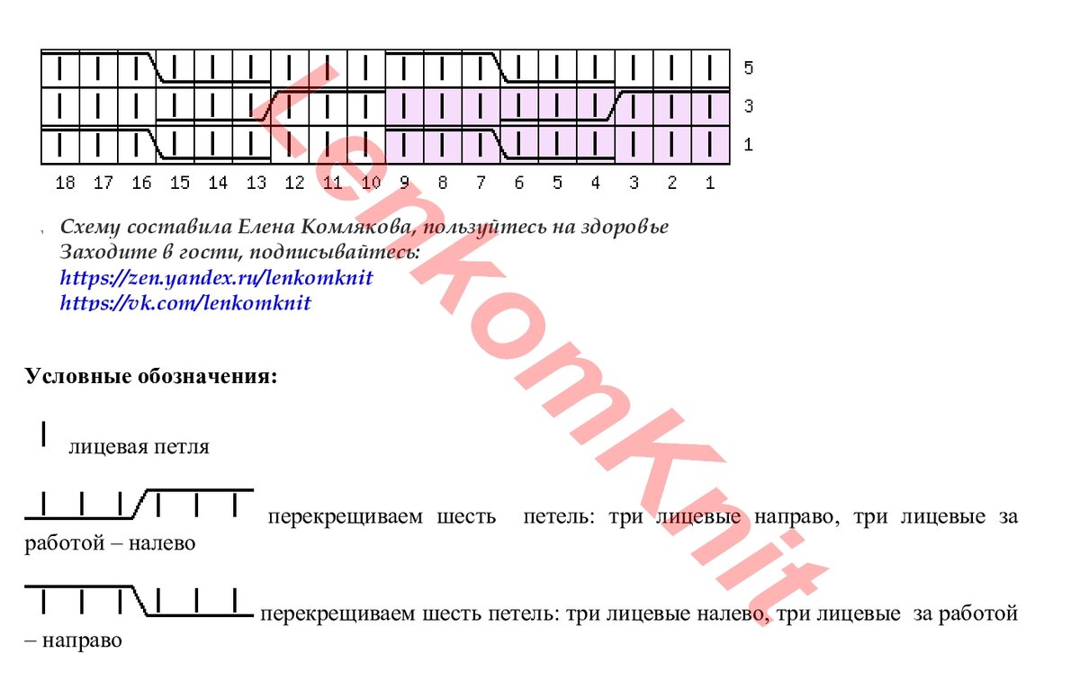 Схема узора "плетенка" - на рисунке (раппорт выделен сиреневым цветом). На рукаве - 6 рядов узора "плетенка", до и после связано по два ряда лицевой глади. Вверху (кокетку) вяжем этим же узором на нужную нам высоту.