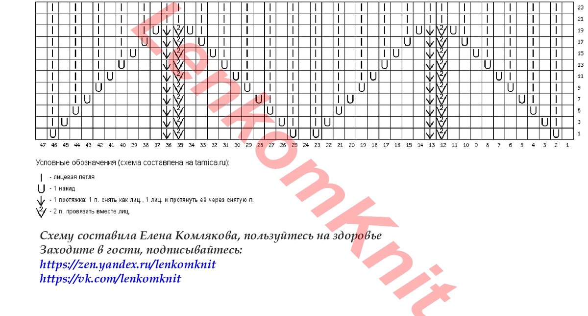 Описываю узор по рядам как при круговом вязании, как он будет выглядеть на лицевой стороне.