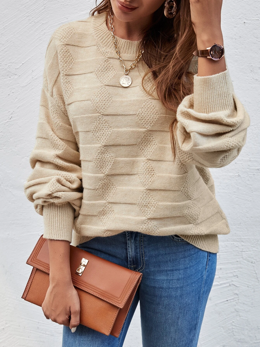 Одиннадцатый свитер мне показался очень классным и нестандартным. Он связан в модном верблюжьем цвете модным же узором "ромбы", между которыми - объемная платочная вязка (а она смотрится намного интереснее обычной изнаночной глади).