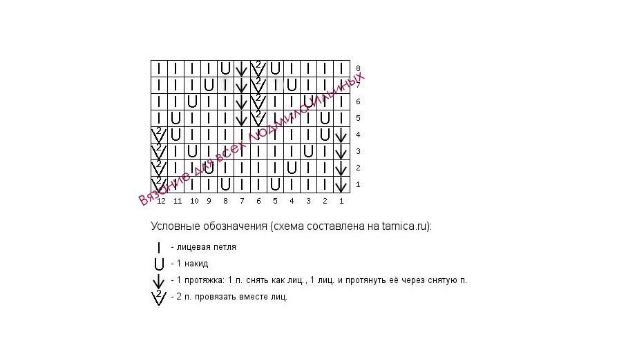Раппорт узора состоит из 12 петель и 8 рядов.