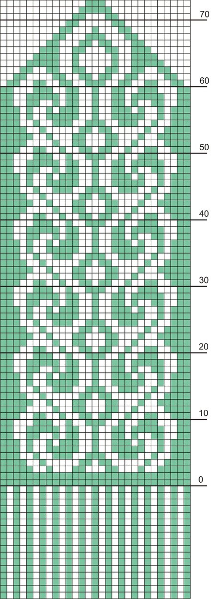 Далее продолжаем вязать по схеме на необходимую длину варежки. У меня получилось 4 раппорта (ВНИМАНИЕ! на схеме последний ряд последнего раппорта отличается от остальных раппортов)