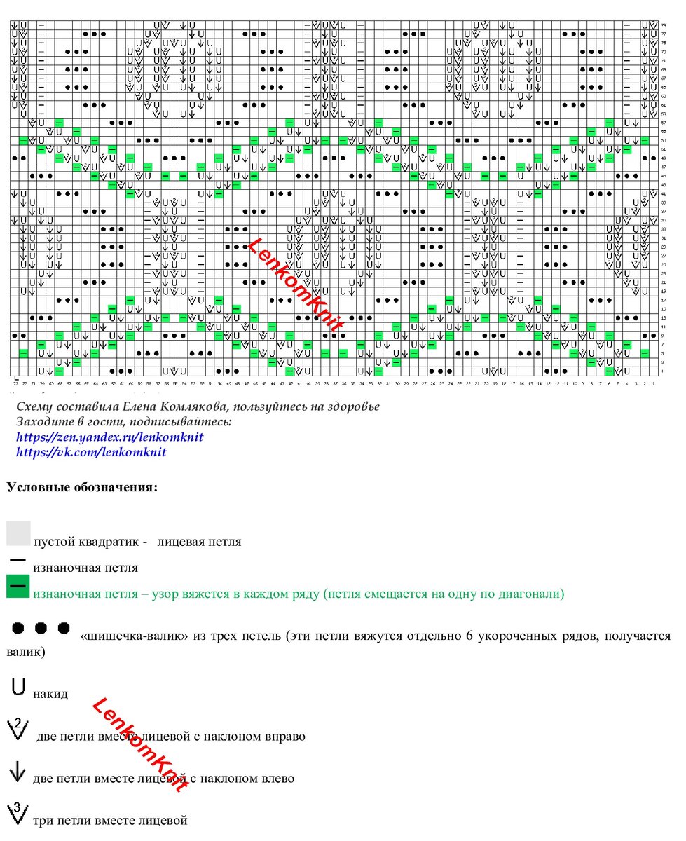 Схема составлена только для лицевых рядов, чтобы не загромождать ее излишней пестротой. Но нужно обратить внимание на один момент: там, где отмечено зеленым, изнаночная петля смещается по контуру и в лицевых, и в изнаночных рядах, образуя диагональную линию.