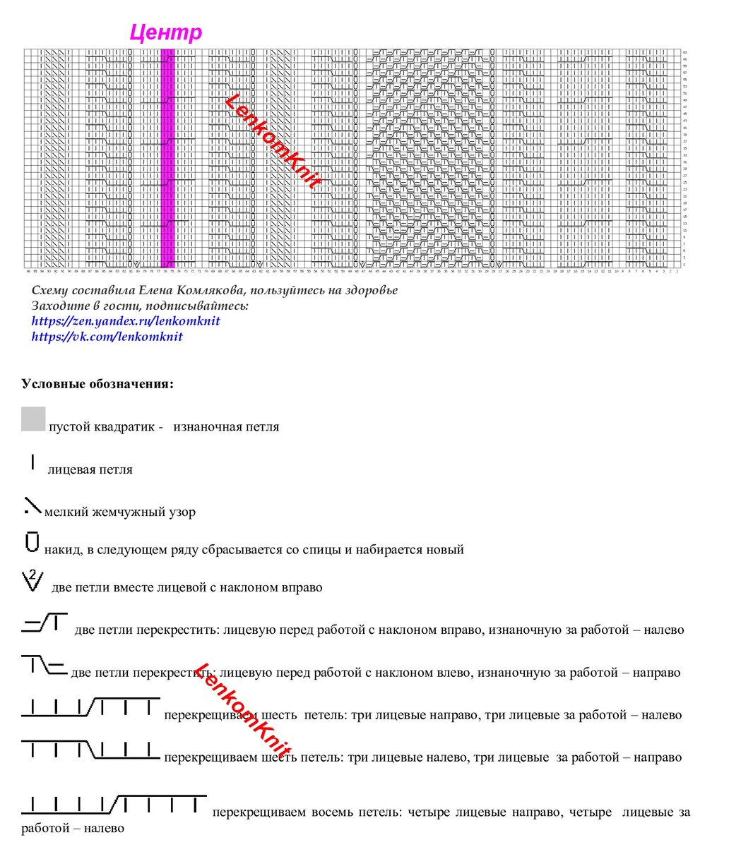 На схеме нарисована правая половина узоров для джемпера, выделен центр схемы. Слева вяжутся такие же узоры, как и справа (симметрично центру).