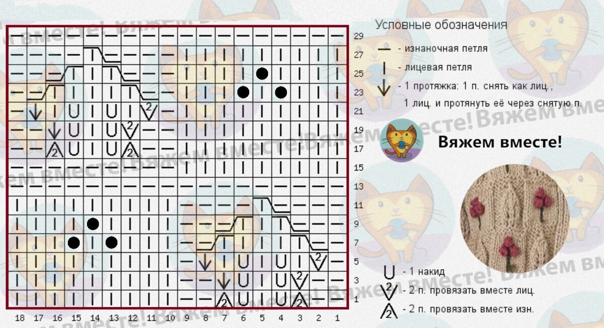 Схема узора ниже, на ней дан одни раппорт узора и только лицевые ряды вязания, изнаночные вяжутся так, как лежат петли на спице. Чёрными кружками обозначены шишечки, их можно вязать любыми удобным для вам способом.