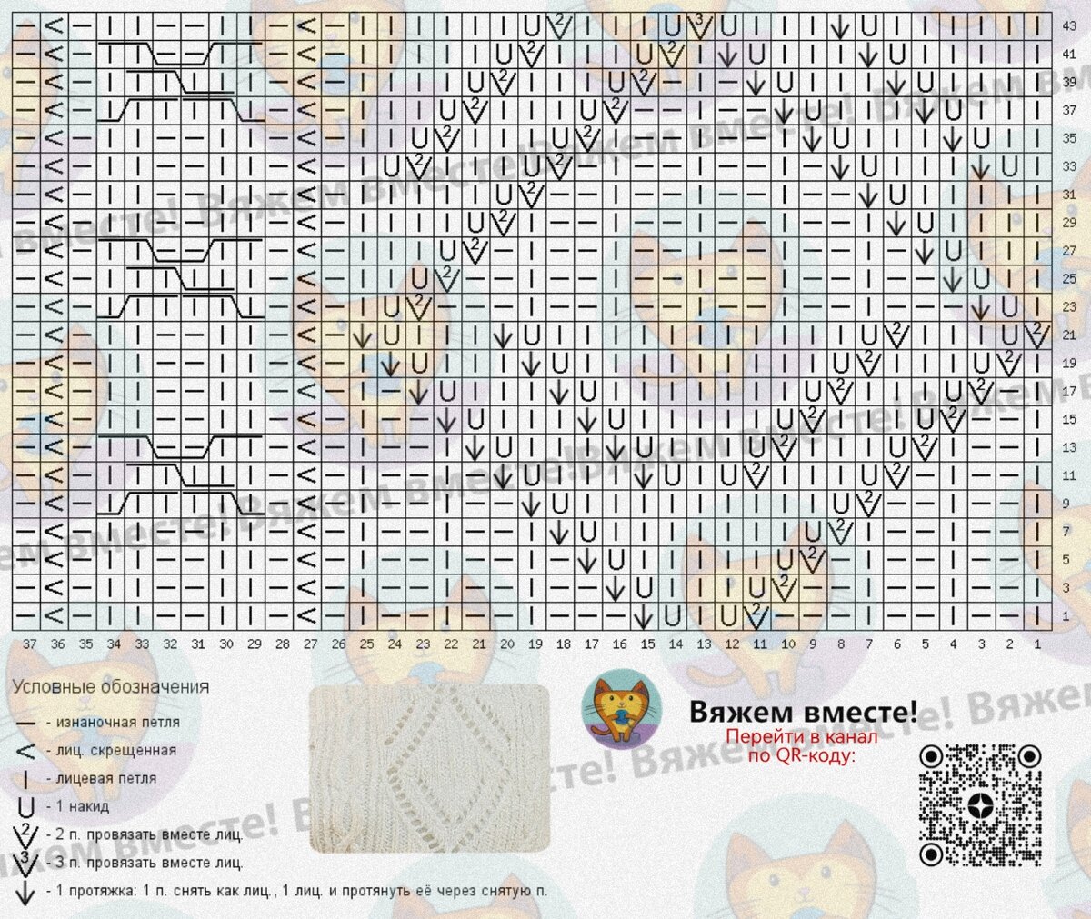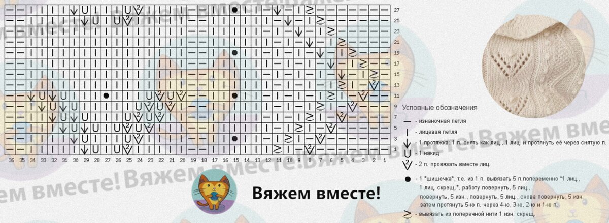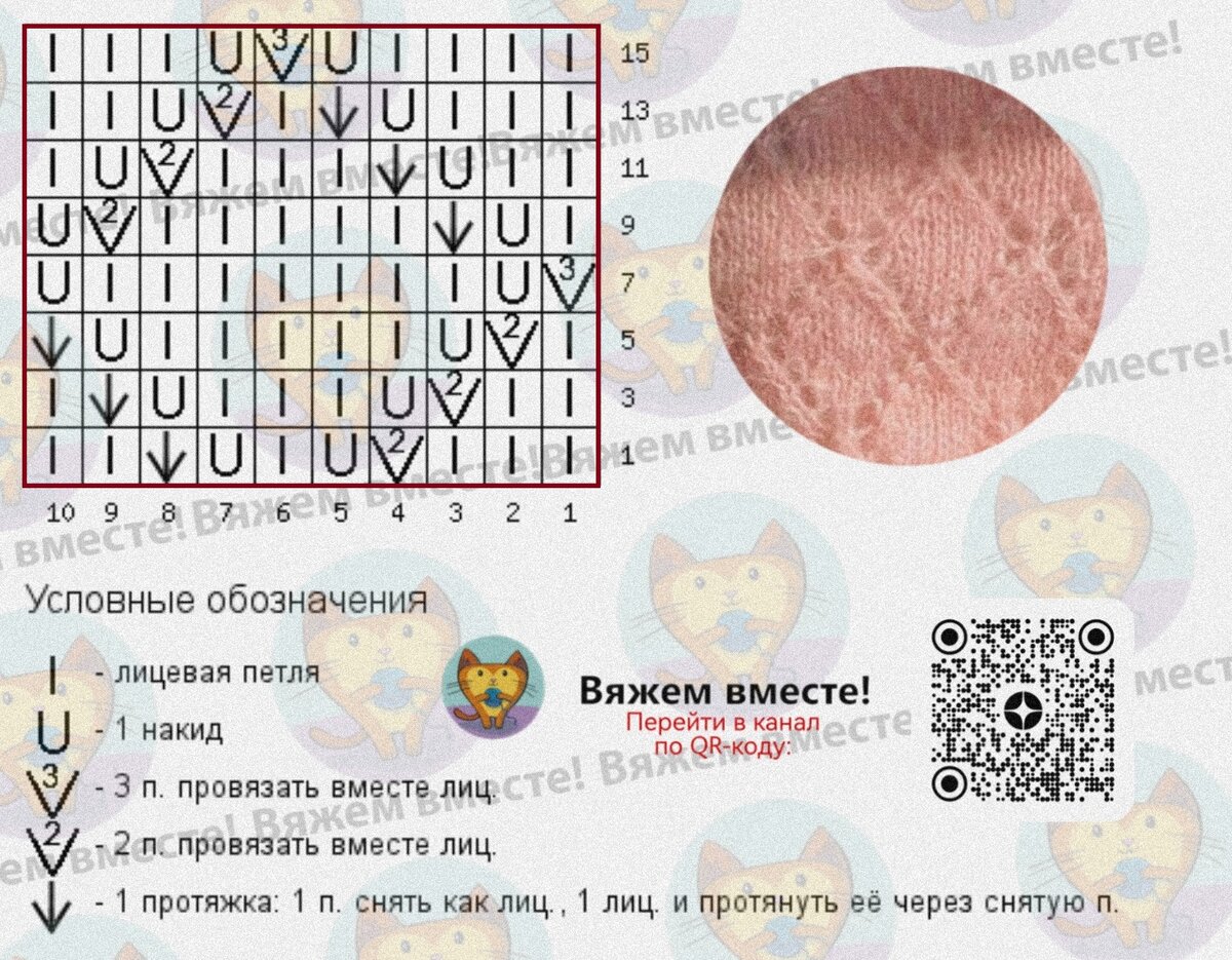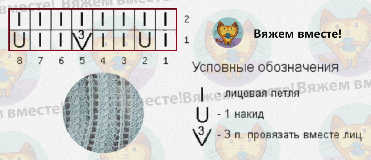 Раппорт ажурного узора составляет 8 петель по ширине и 2 ряда по высоте. Чётный ряд раппорта на схеме обозначен так, как петли лежат по лицевой стороне.