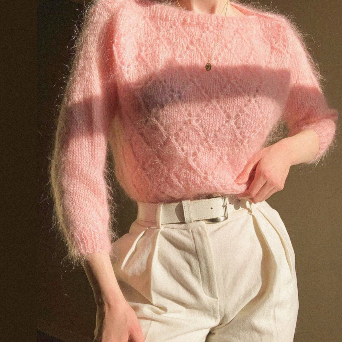 Следующая модель хоть и простая, но не менее симпатичная чем представленные ранее варианты изделий в винтажном стиле, — это женственный выполненный из воздушного мохера джемпер с ажурными ромбами по детали переда.
