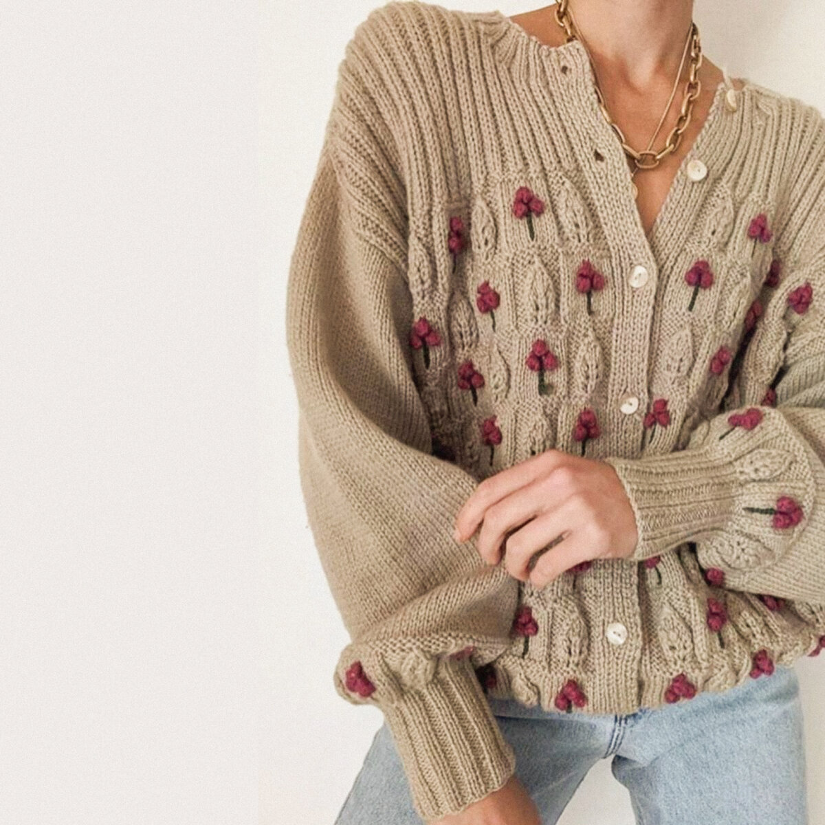 Симпатичный кардиган с простым плетёным узором, ажурными листьями, шишечками и вышивкой. Как по мне, модель очень практичная: идеальная длина, пряжа средней толщины, застёжка на пуговицы — беспроигрышный вариант для любой непонятной погоды.