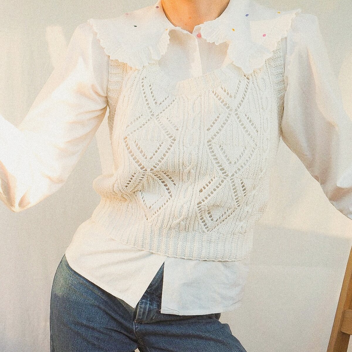 Первая из них — кремовая безрукавка с крупными ажурными ромбами и вертикальными косами.