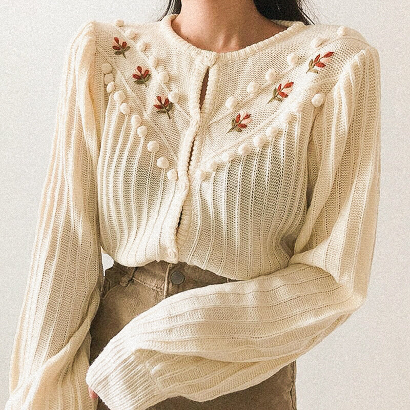Следующая модель — романтичная кофта на пуговицах, украшенная шишечками и вышивкой по треугольной кокетке.