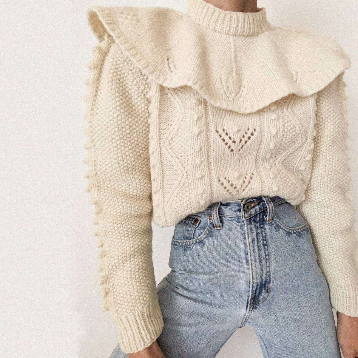 Необычная модель джемпера с комбинацией узоров и неоднозначным элементом в виде объемного идущего от воротника волана, расположившийся в верхней части изделия.