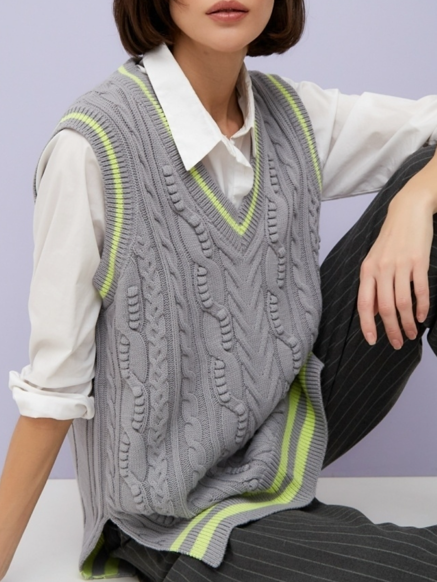 Первая безрукавка связана интересными косами, ее освежают желтые полоски. Они же придают актуальный и динамичный вид. Без этих полосок модель не выглядела бы так выигрышно.