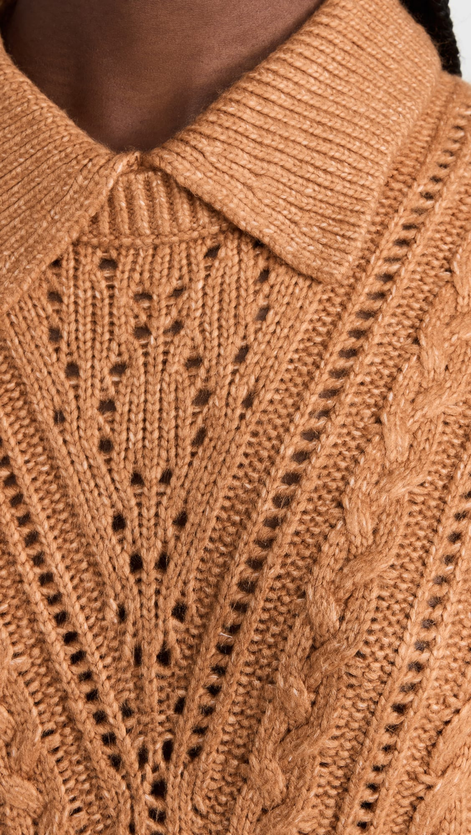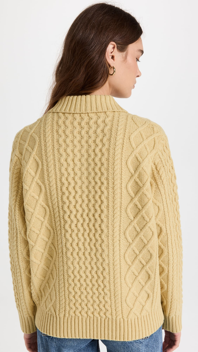 Эта модель ванильного цвета примечательна своими многочисленными рельефными узорами и актуальным воротничком - поло на три пуговки (связан резинкой 1х1).