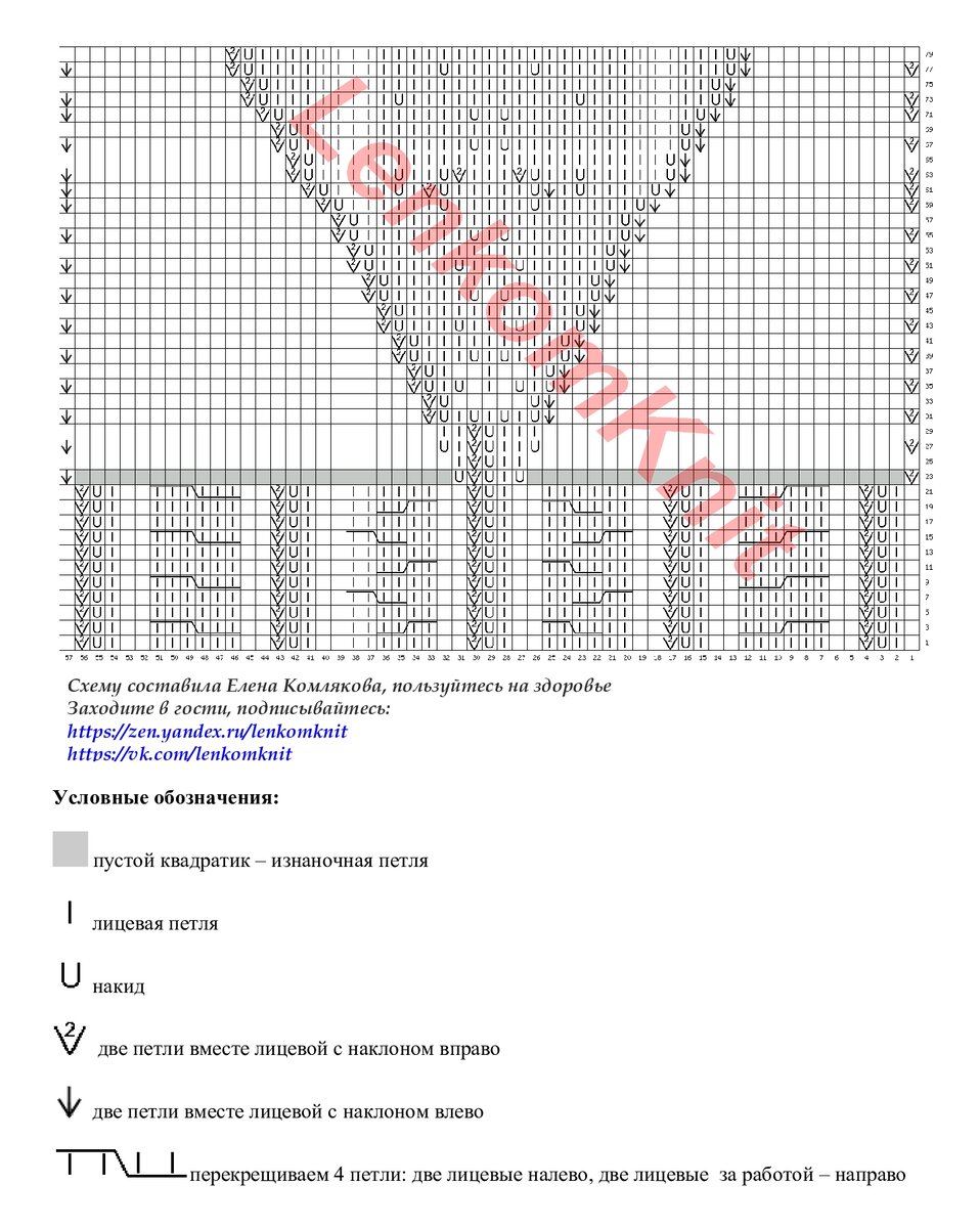 На рисунке - раппорт узора в высоту. В ширину начинаем с петель с 1 по 12, затем повторяем нужное количество раппортов с 13 по 26 петли и заканчиваем петлями с 27 по 42.