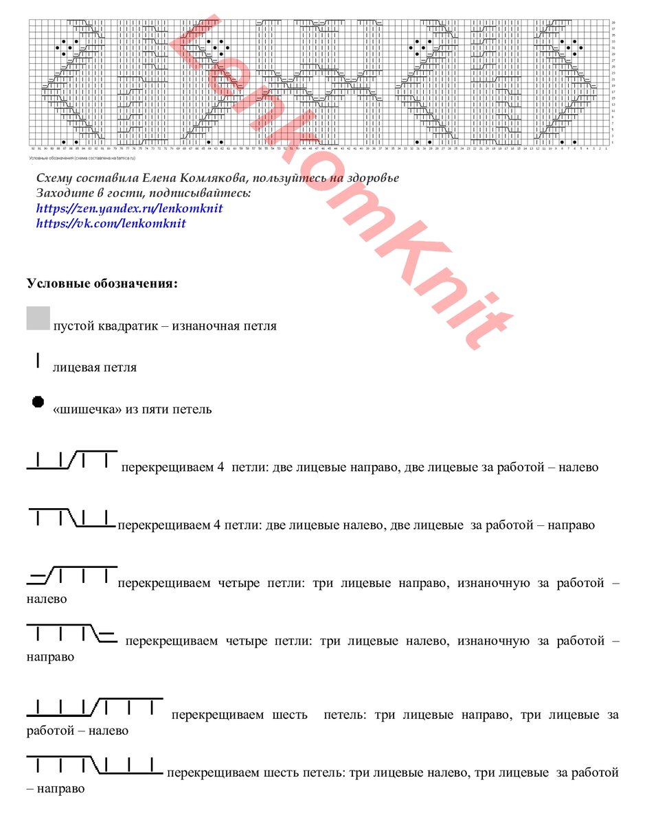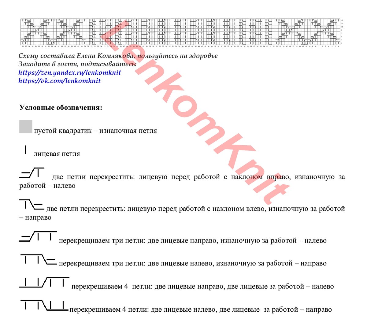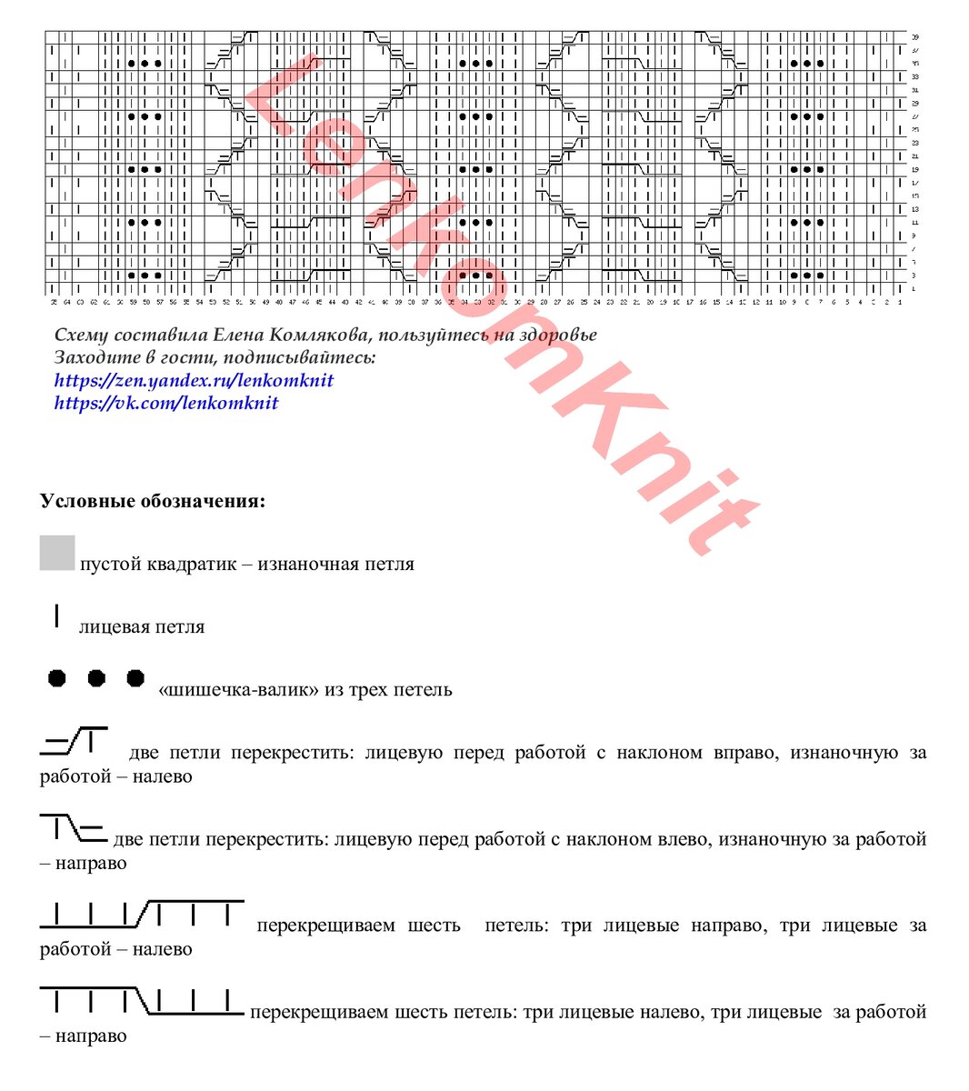 На рисунке - схема узора (центральная часть) и условные обозначения. На схеме полный раппорт интересных широких кос, а раппорт остальных узоров понятен, они несложные.