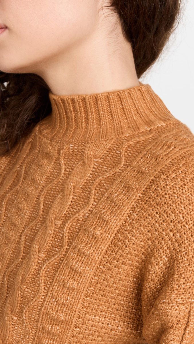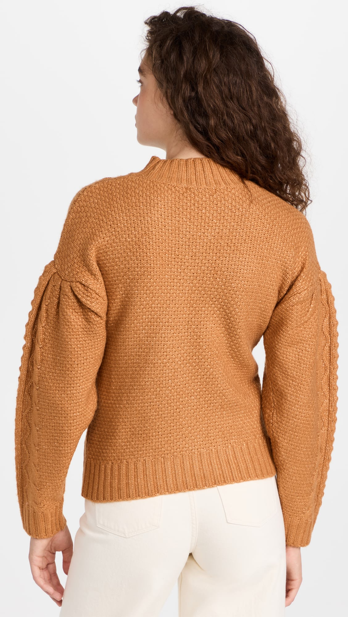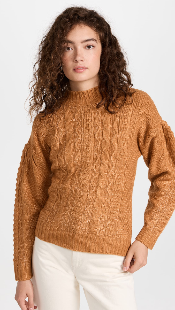 У этого пуловера модный верблюжий цвет и рукав актуальной формы - по типу фонарика. В остальном это классическая модель с круглым воротом - стойкой и геометрическим рельефным узором.
