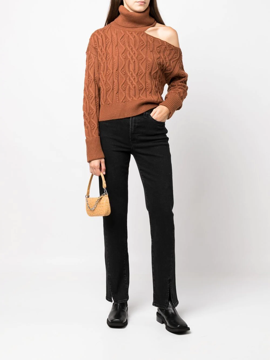 На этом фото видно, как свитер вписывается в гардероб. В этой модели много неизбитых геометрических узоров (особенно интересны широкие необычные косы) и интересное плечо.