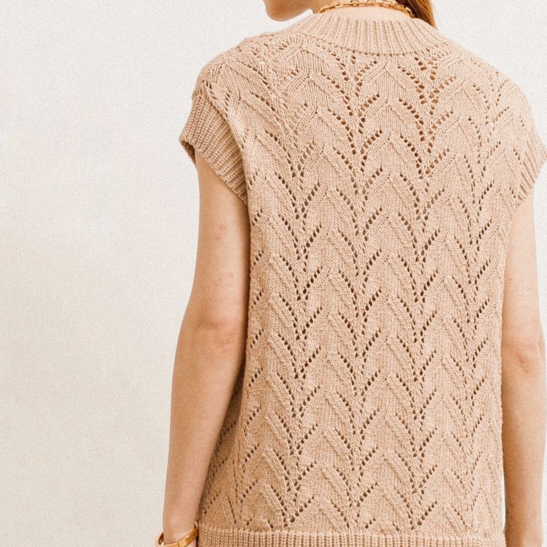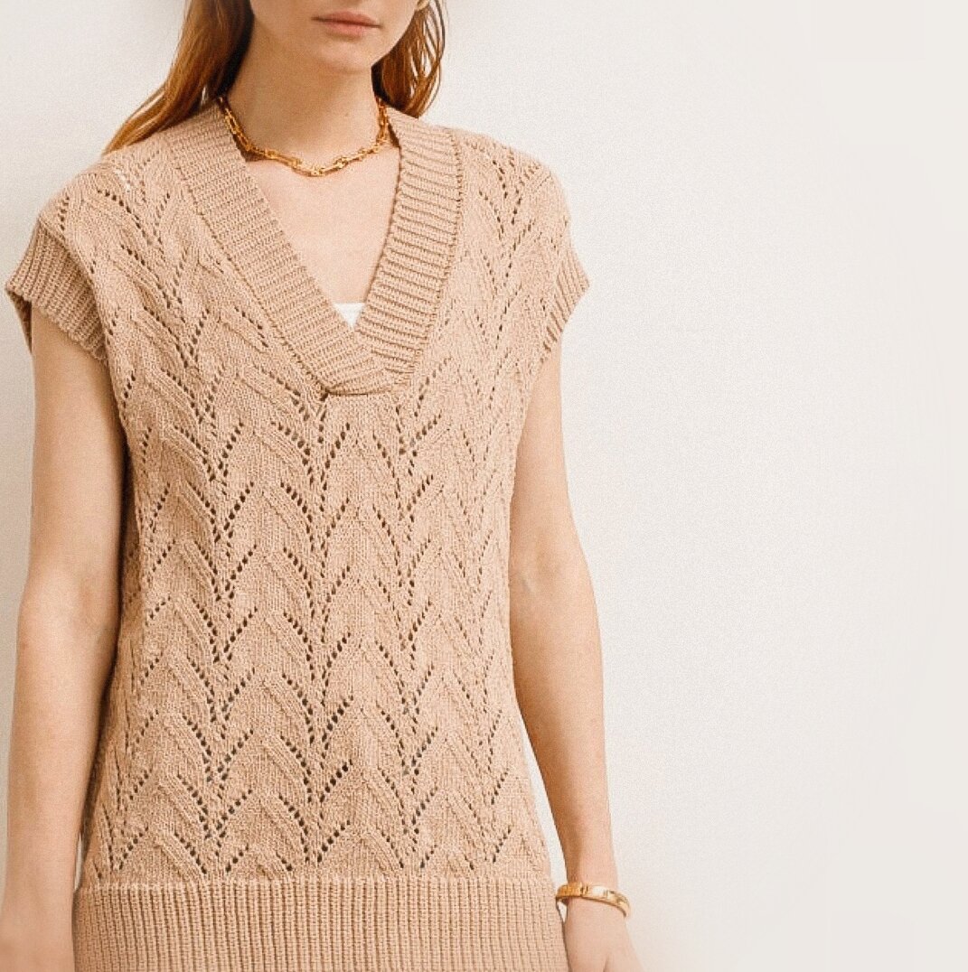 Ещё одна удлинённая безрукавка расслабленного фасона. Выполнена более простым ажурным узором, нежели предыдущий вариант — узор формируется за счёт накидов и убавлений на фоне лицевой глади.